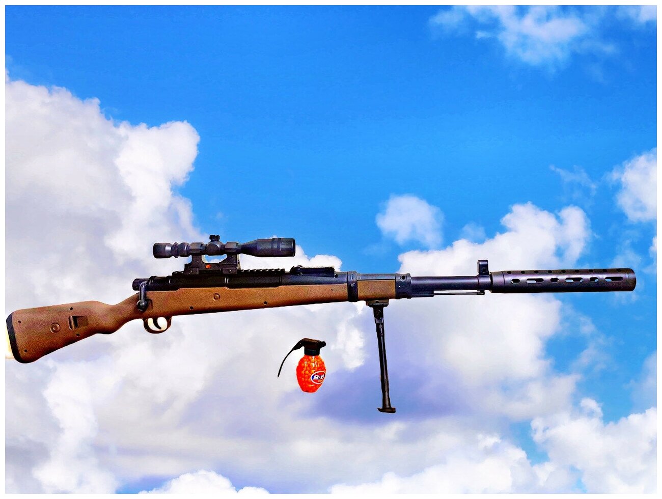 | Комплектация | Комплектация: -Винтовка - Лазерный прицел - Сошки - Глушитель (имитация) Размер: - Длинна с глушителем - 100см. - Высота на сошках и с оптически прицелом 22 см |