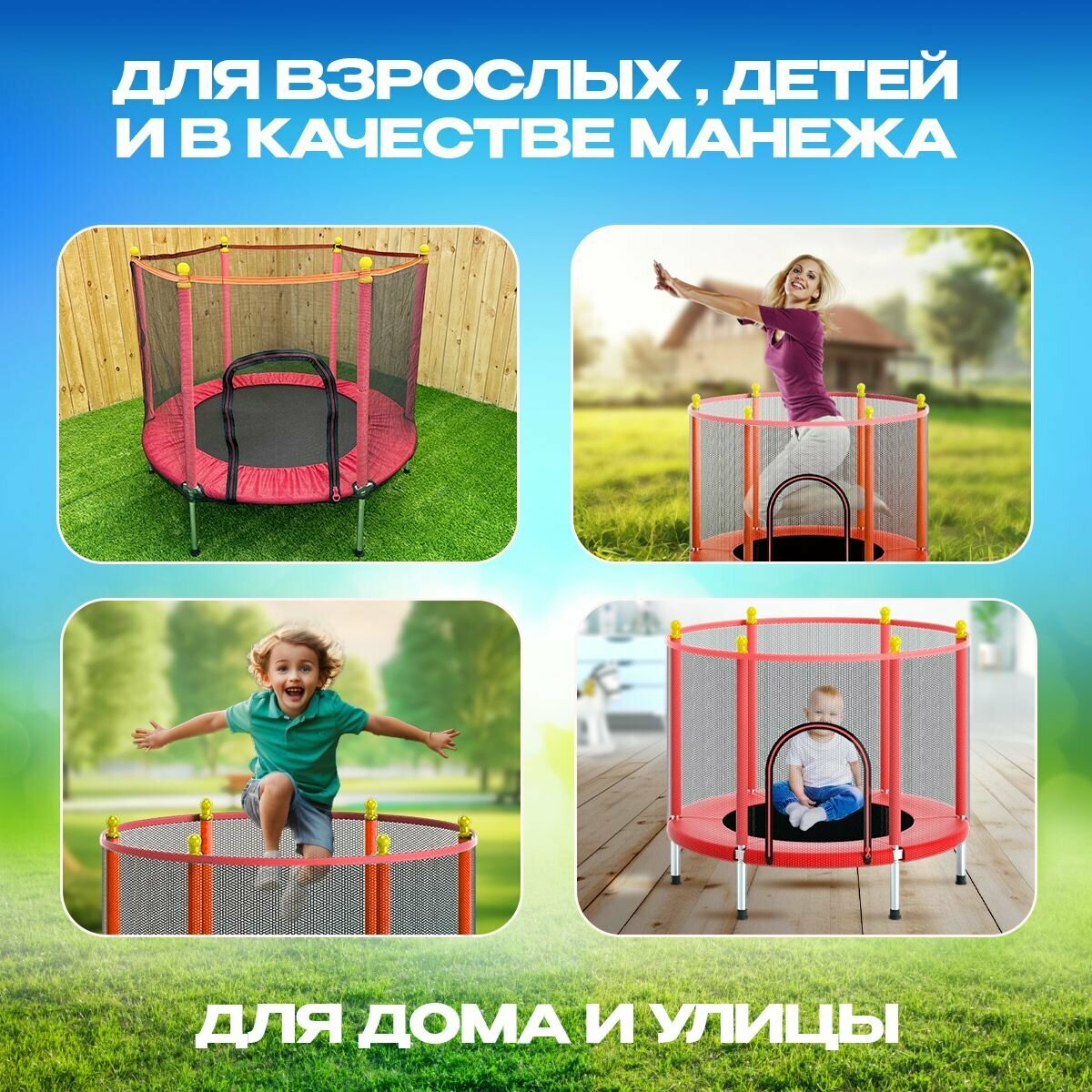 Батут с защитной сеткой детский и для взрослых каркасный уличный для джампинга и дома дачи спортивный манеж для малышей мини 140 см красный интересное: