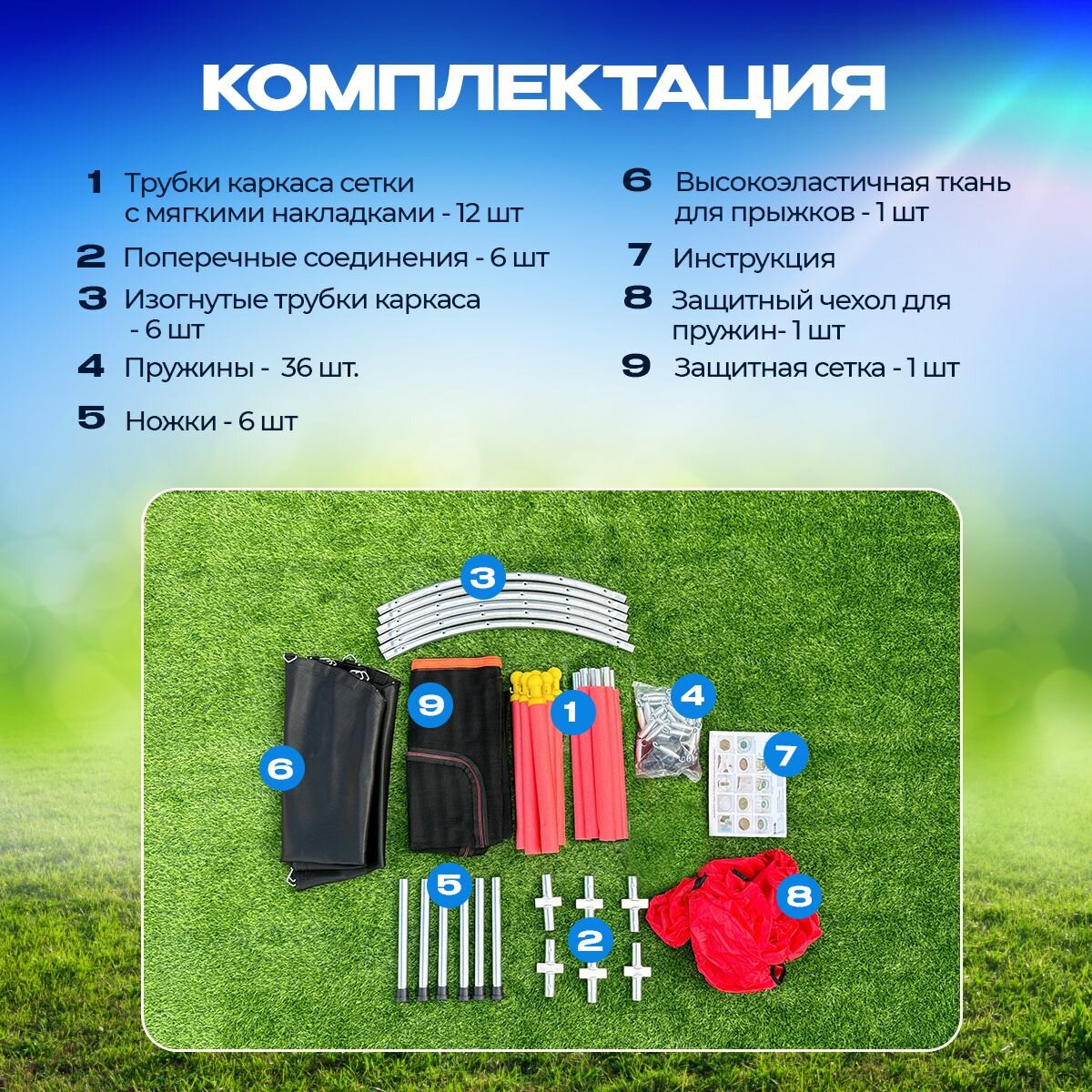 | Состав набора | 1) Трубки каркаса сетки с мягкими накладками - 12 шт 2) Поперечные соединения - 6 шт 3) Изогнутые трубки каркаса - 6 шт 4) Пружины - 36 шт 5) Ножки - 6 шт 6) Высокоэластичная ткань для прыжков - 1 шт 7) Защитный чехол для пружин - 1 шт 8) Защитная сетка - 1 шт 9) Инструкция |