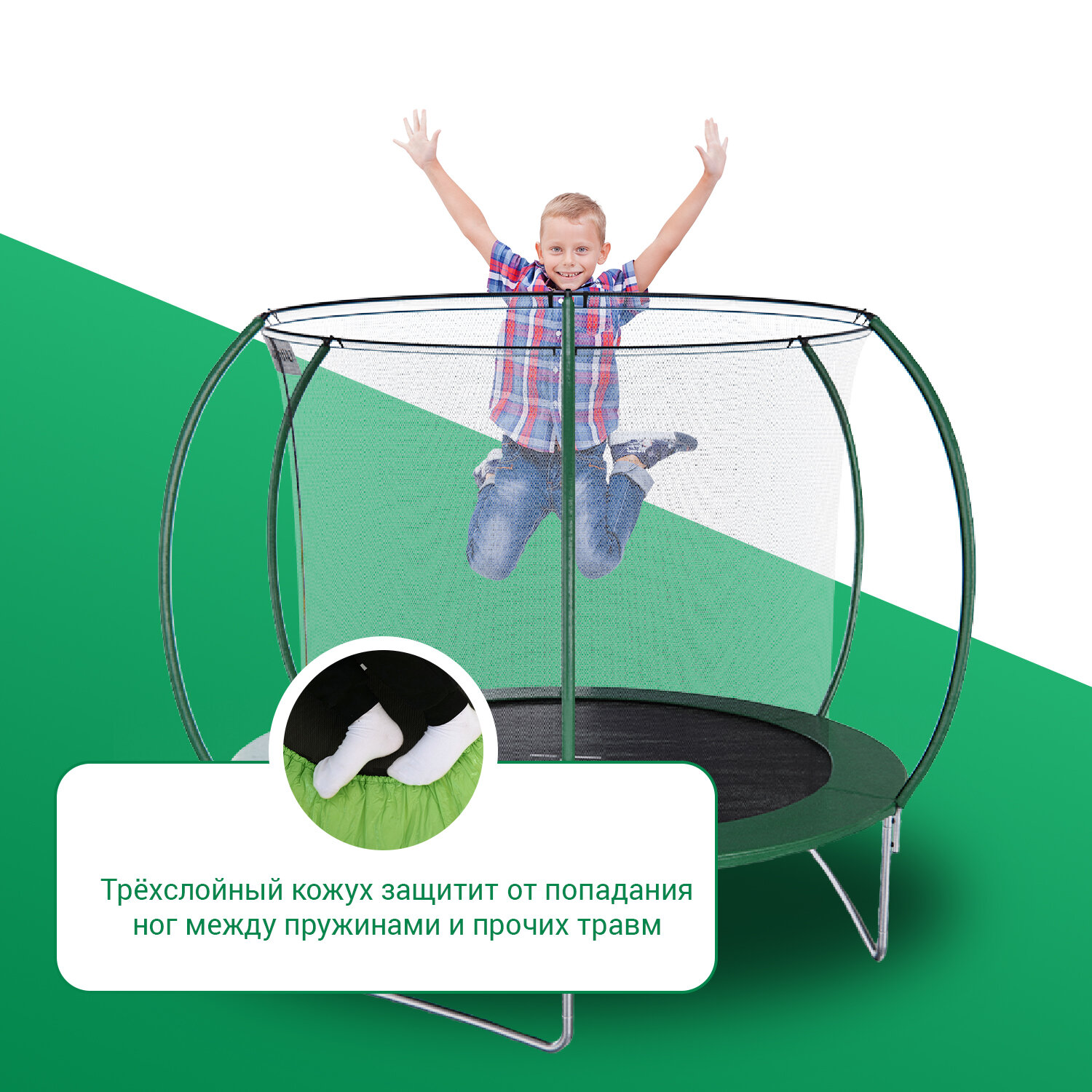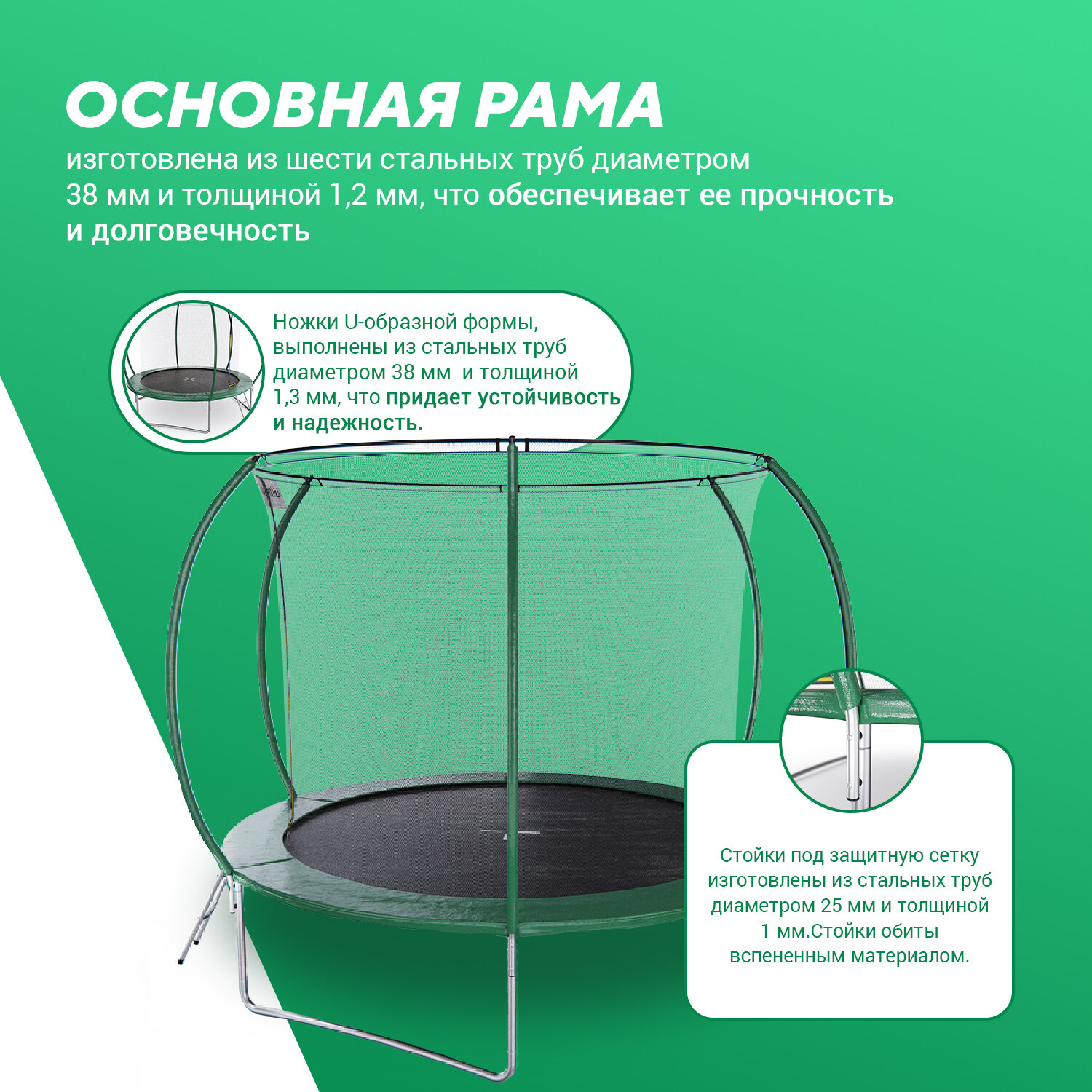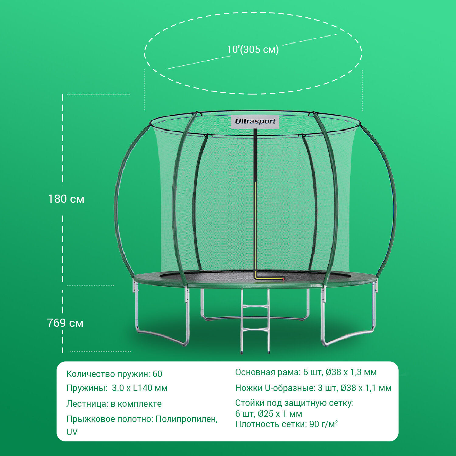 Батут каркасный DFC ULTRASPORT 10 ft с внутренней сеткой, лестница в комплекте, зеленый, 305 см, нагрузка 150 кг. интересное: