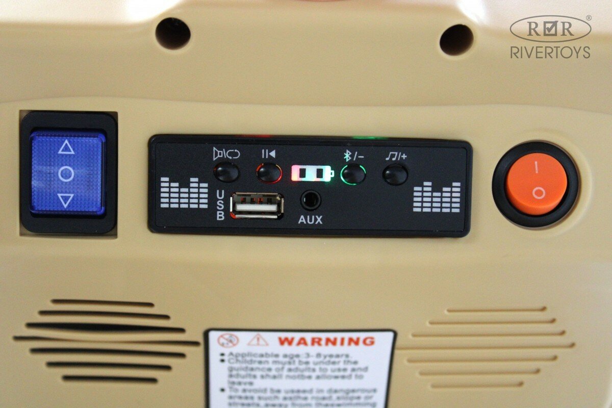 | Дополнительная информация | Световые эффекты: фары передние, задние. Звуковые эффекты: заводские мелодии/звук клаксона. Пульт управления: нет. Амортизаторы: да, задние. Включение: кнопка. Индикатор заряда батареи: да. Колеса: пластик. Скорость: вперед/назад, 3км/ч. Сидение: пластик. Включение: кнопка. Медиа-панель: USB-вход, AUX-вход, Bluetooth. |