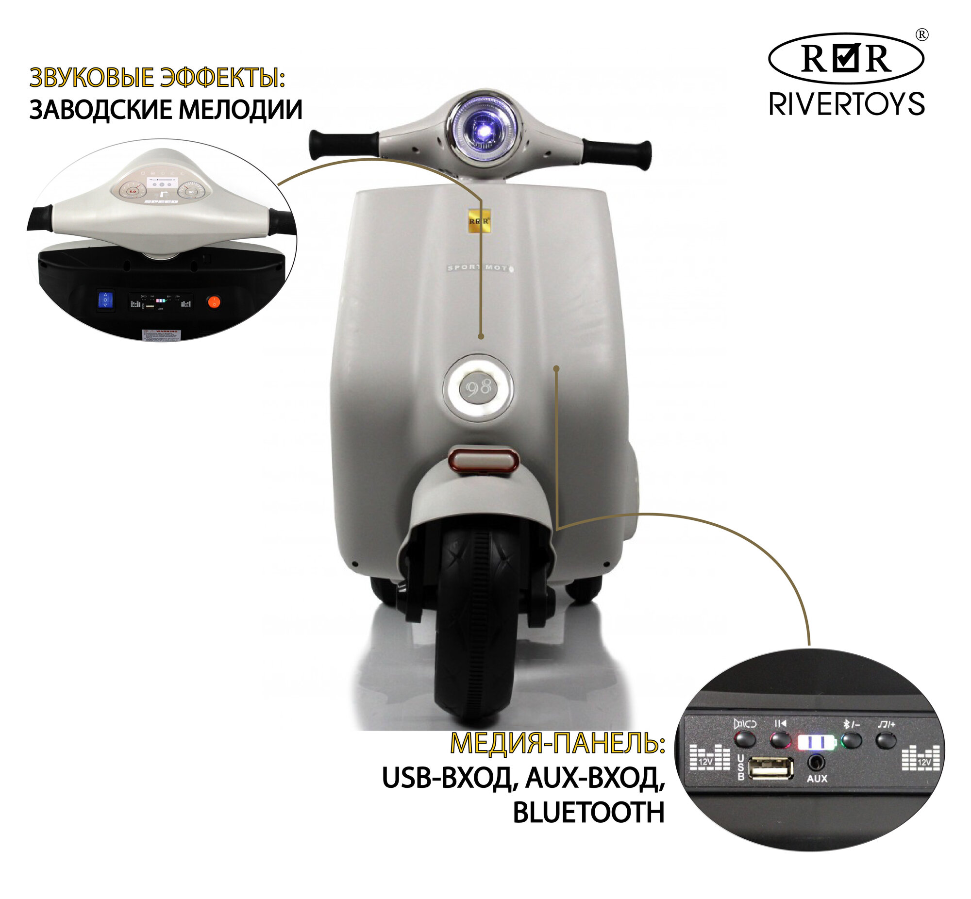 Ниже Вы можете прочитать отзывы на Rivertoys Детский электроскутер K444PX-A серый, ознакомится с подробными характеристиками, посмотреть интересные обзоры и фотографии на Rivertoys Детский электроскутер K444PX-A серый.