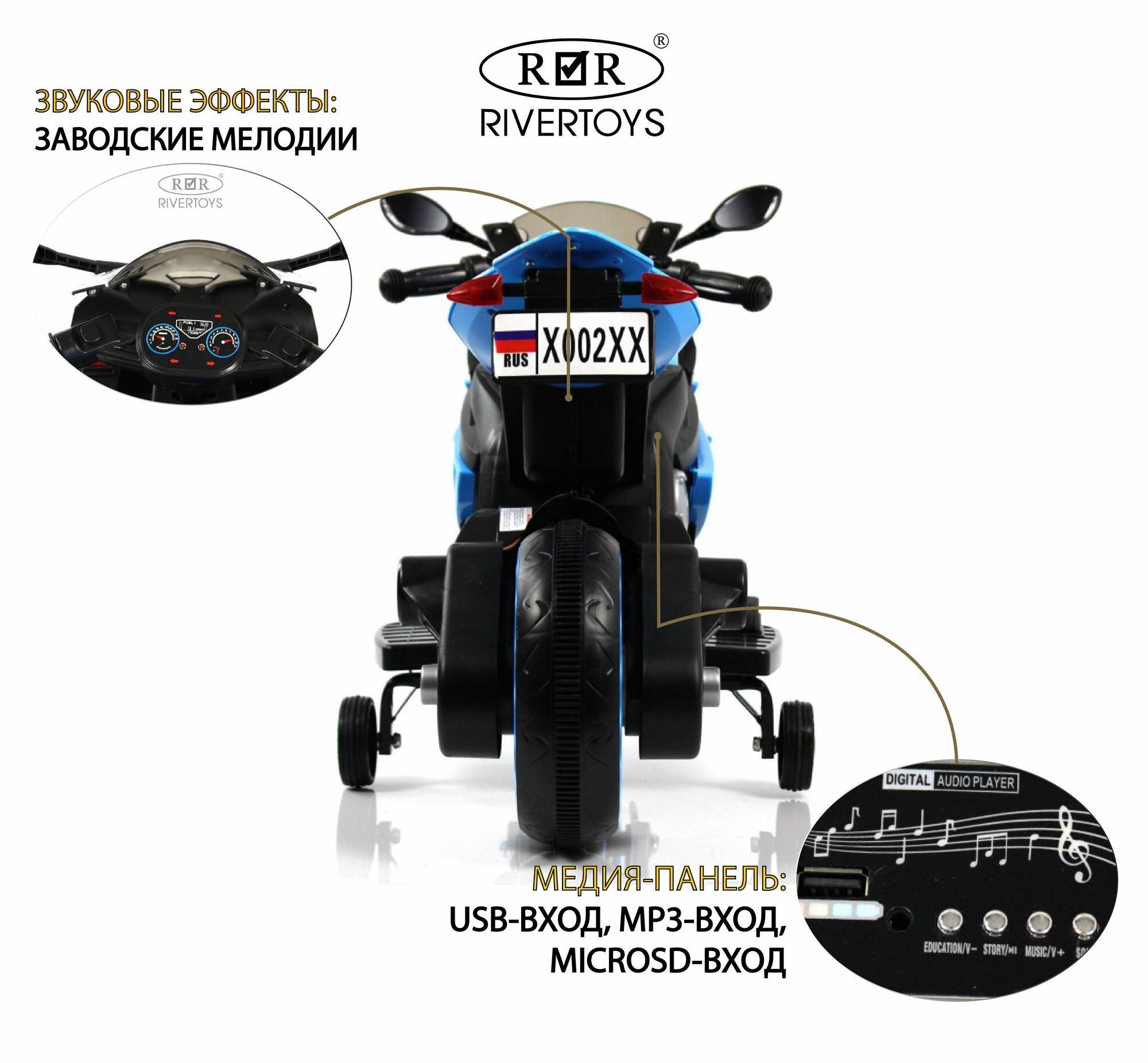 Детский электромотоцикл X002XX бело-синий интересное: