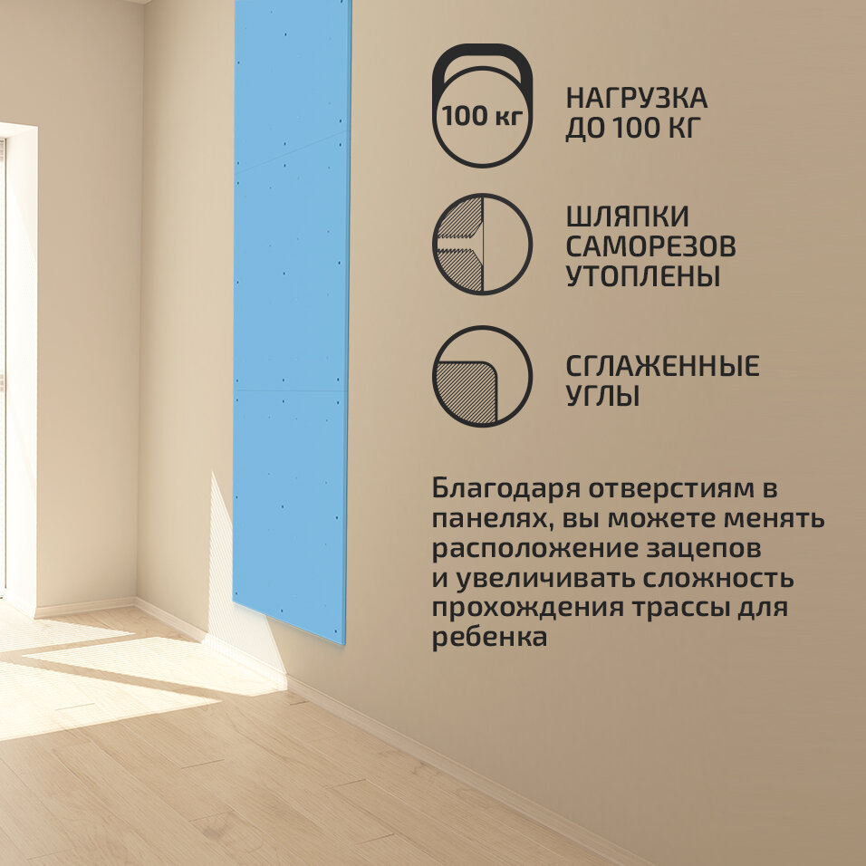 | Дополнительная информация | Зацепы можно переставлять в просверленные в скалодроме отверстия усложняя трассу для ребенка |
