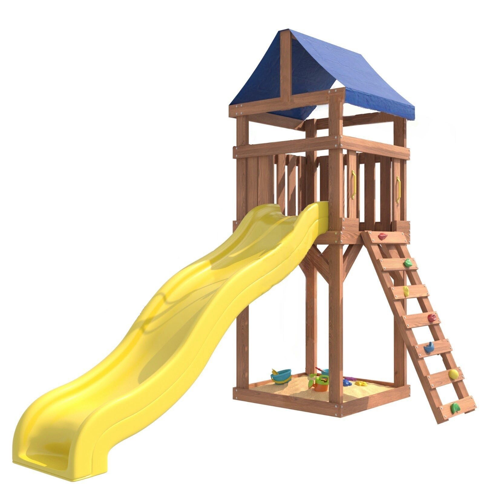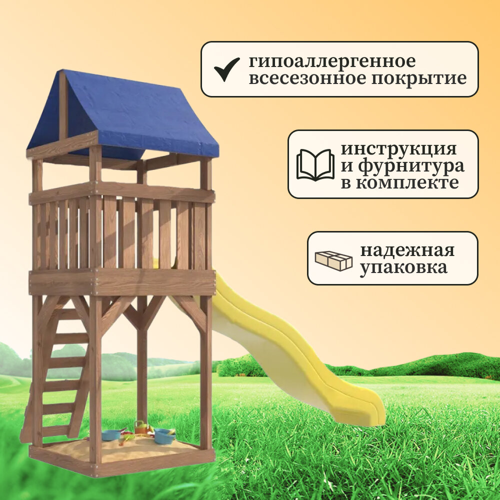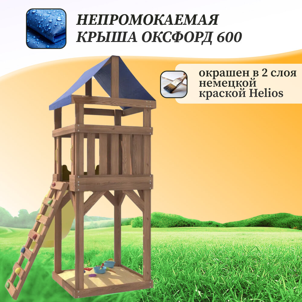 | Комплектация | • Башня с тентом;• Горка; • Скалодром; • Песочница под башней; |