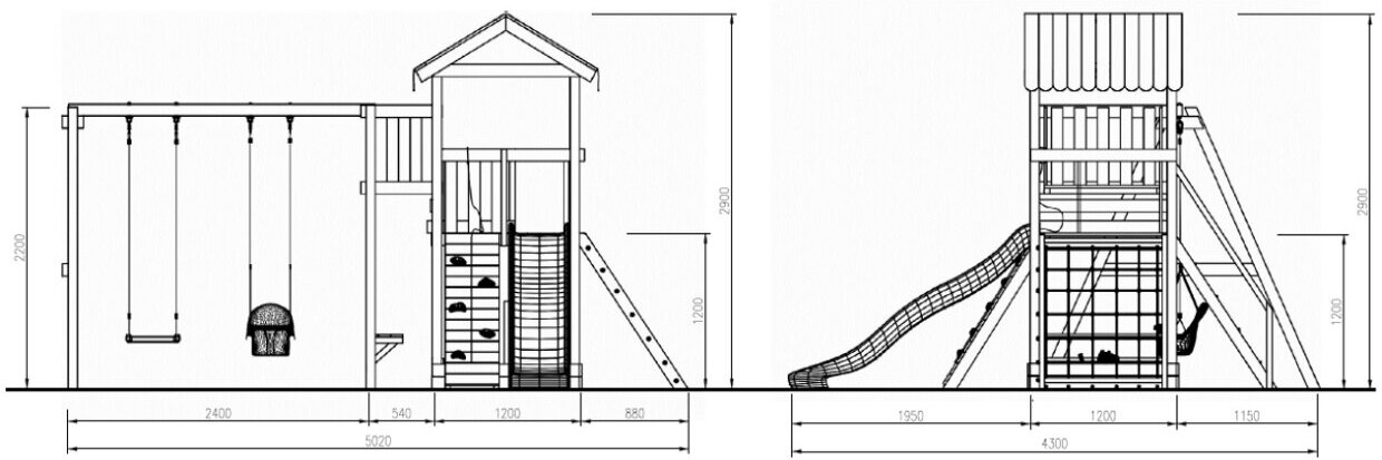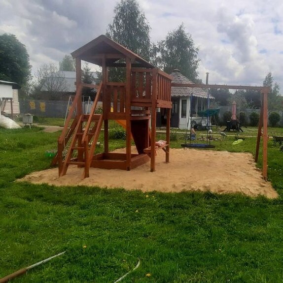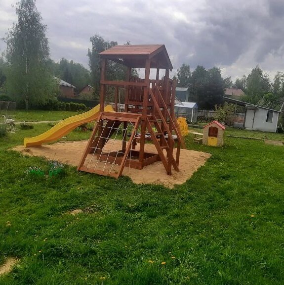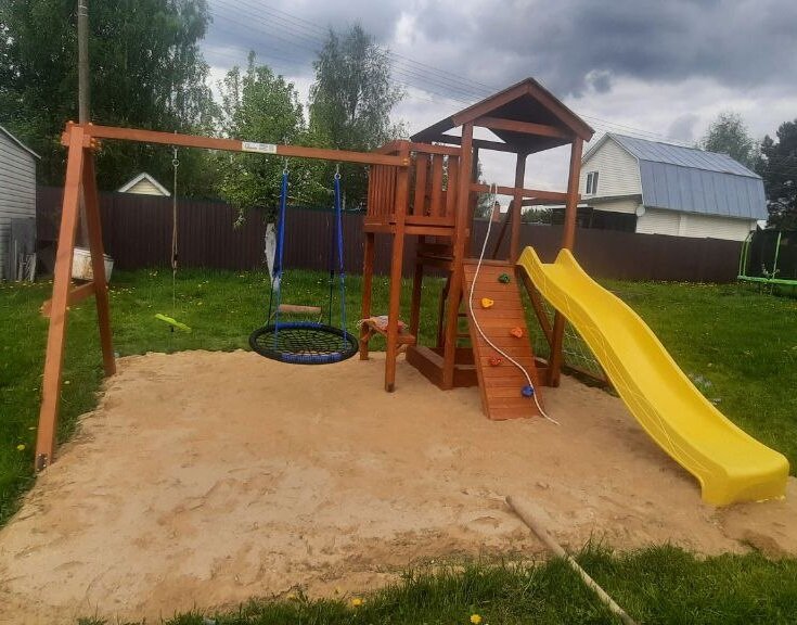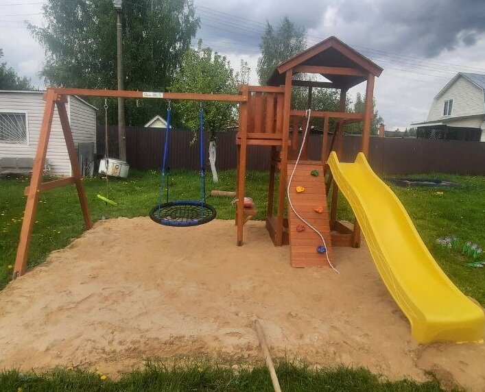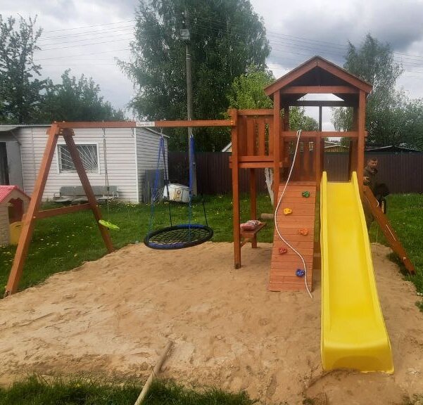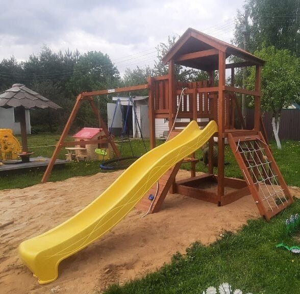 | В комплекте | горка, домик, канат, качели, лестница, песочница, сетка для лазания, скалолазная стенка |
