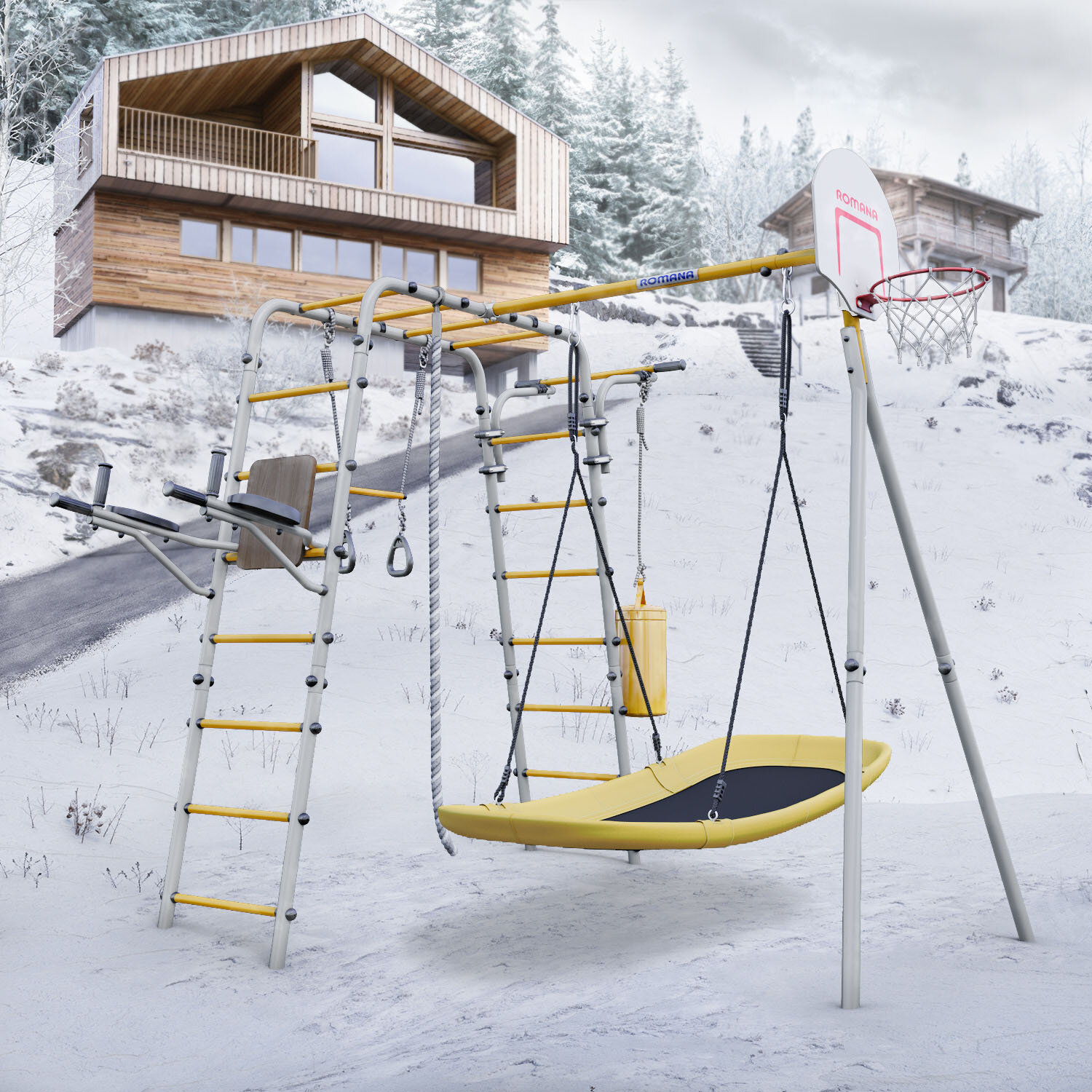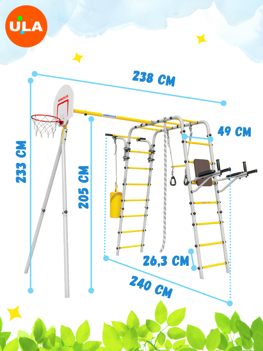 | В комплекте | баскетбольное кольцо, боксерская груша, канат, качели, лестница, рукоход, трапеция с кольцами, турник |