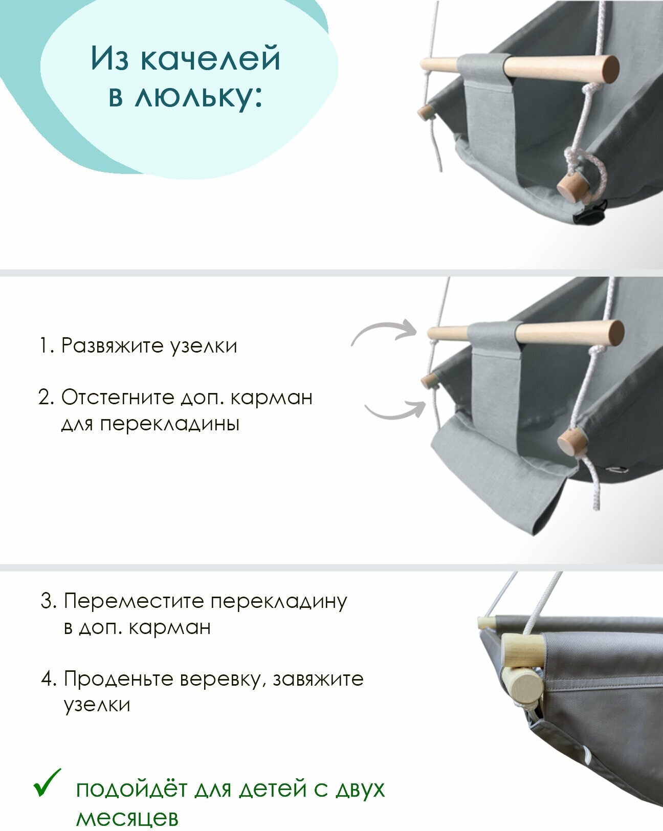 | Комплектация | Качели, две подушки, крепление (2 анкера и 2 карабина), ремень безопасности |