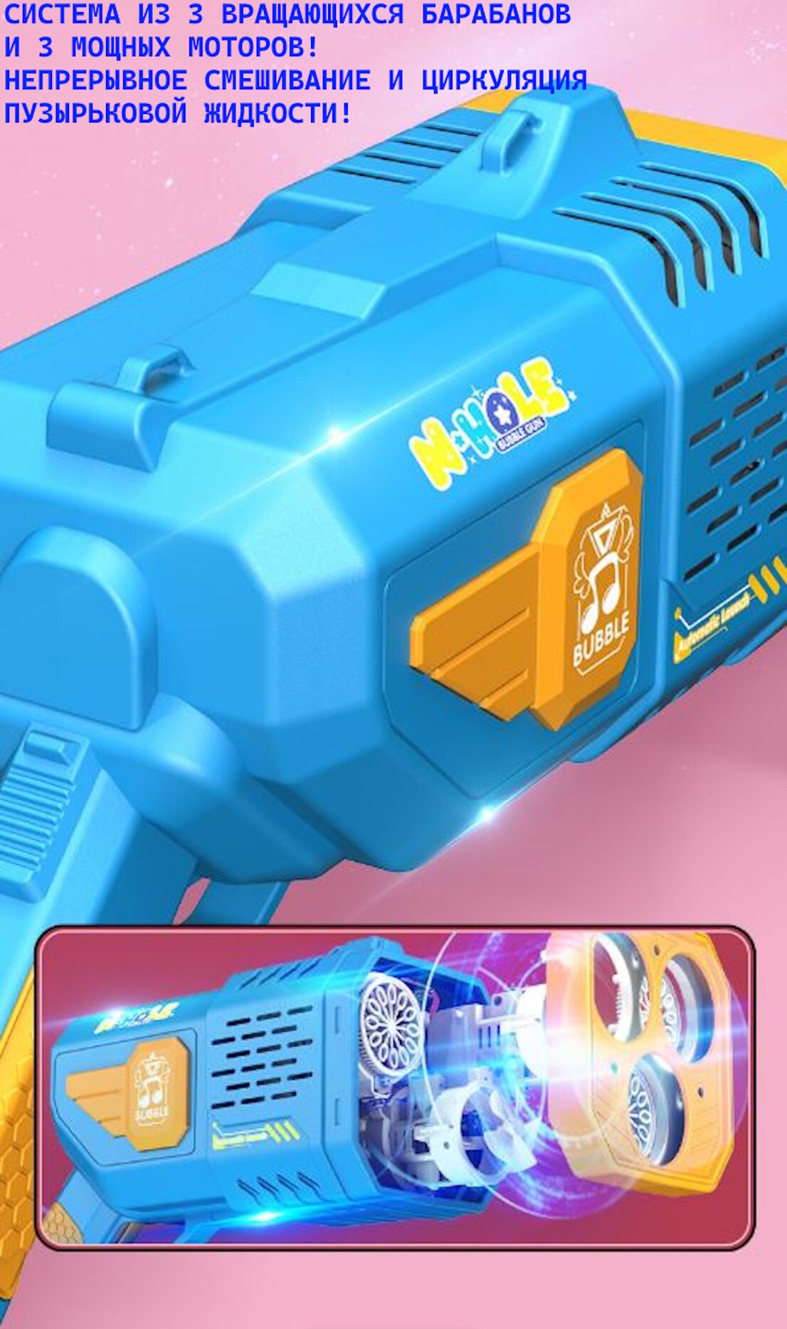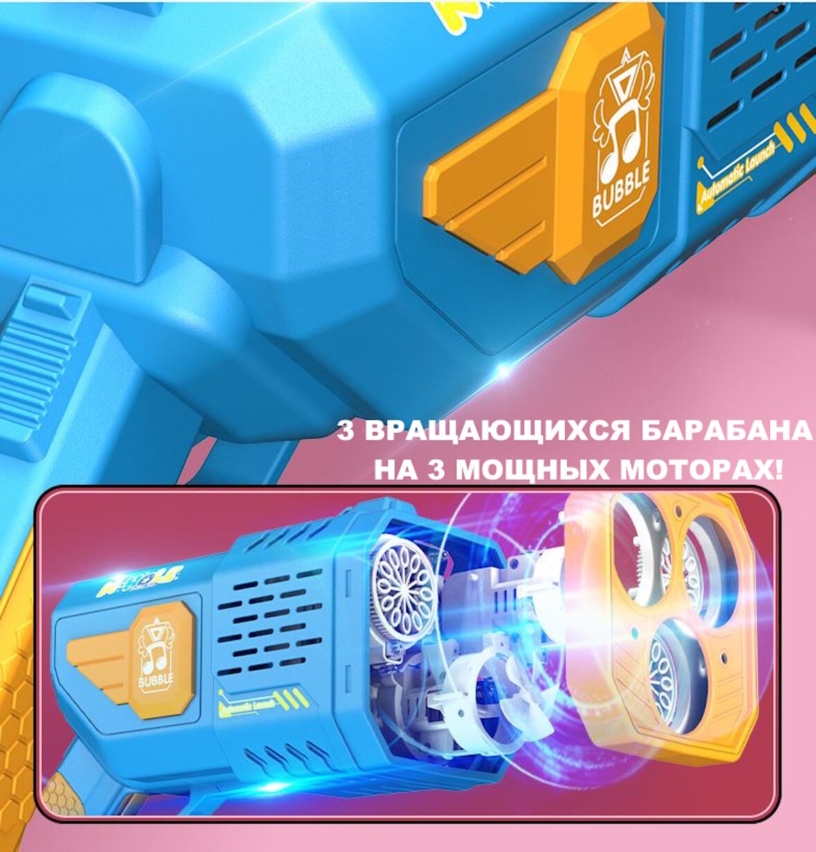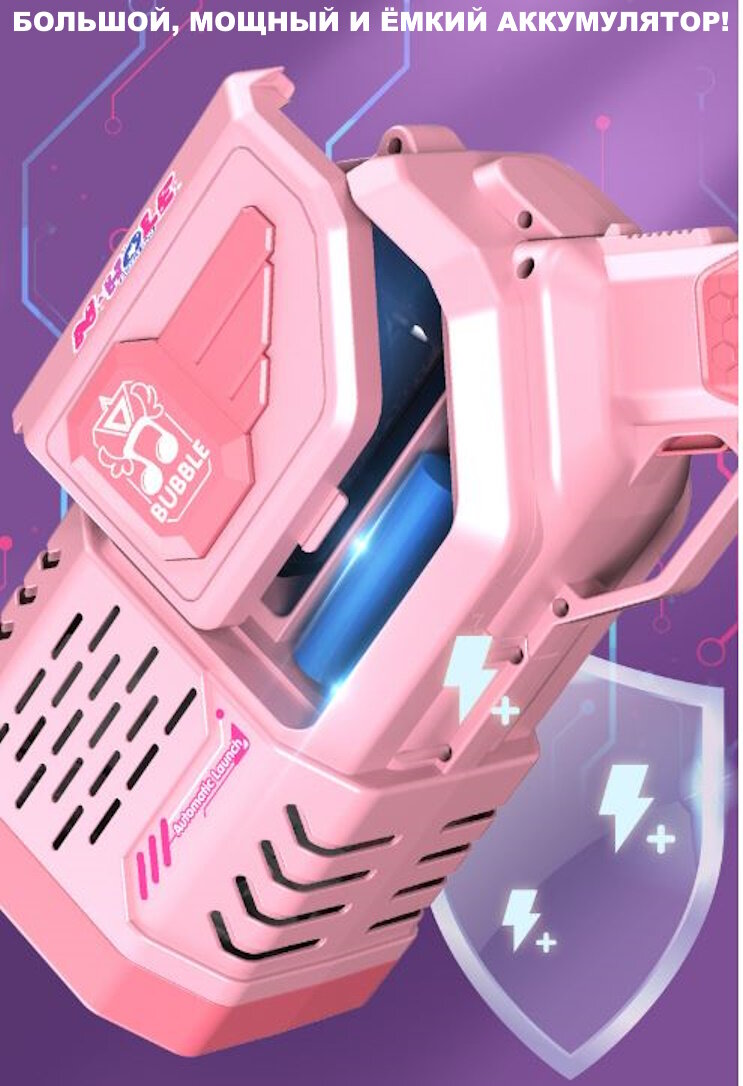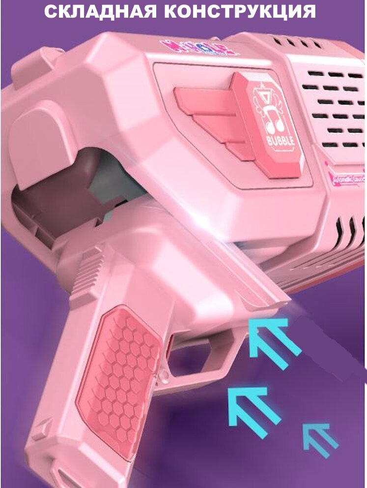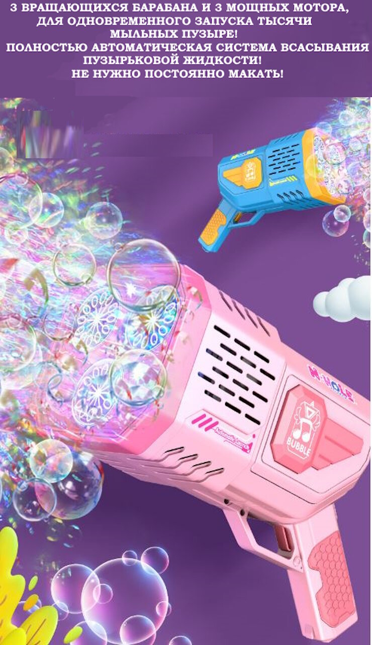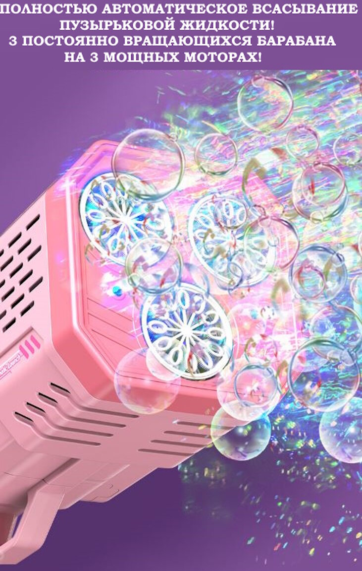 Генератор мыльных пузырей Мега Базука полностью автоматическая/Непрерывный поток не нужно макать 3 вращающихся барабана 3 мотора/+50 упаковок/Розовый