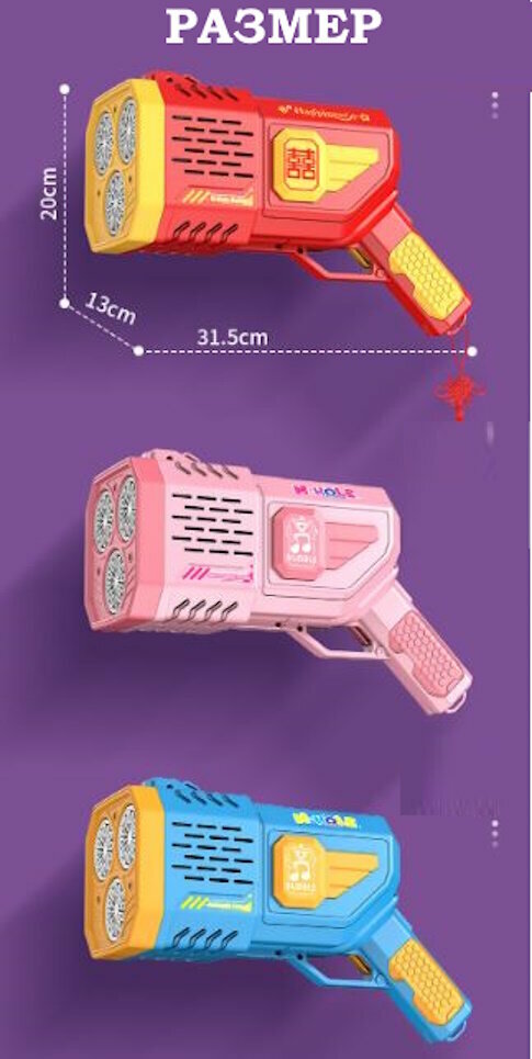 | Дополнительная информация | В комплекте с Мега Базукой идет 2 ёмкости с пузырьковым раствором по 130мл. и целых 50 упаковок с концентратом мыльных пузырей по 10мл.! (Концентрат следует разводить с водой в пропорциях примерно 1 к 5). |