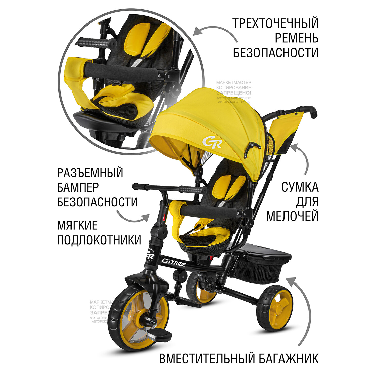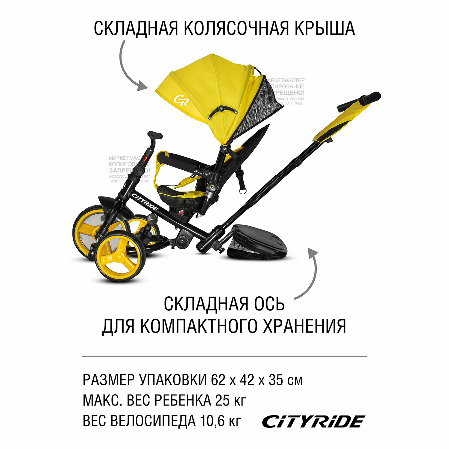 Купить Велосипед детский трехколесный ТМ CITYRIDE, колеса ЕВА 10"/8", 120◦ наклон спинки, родительская ручка, сумка для мелочей, CR-B3-09YW