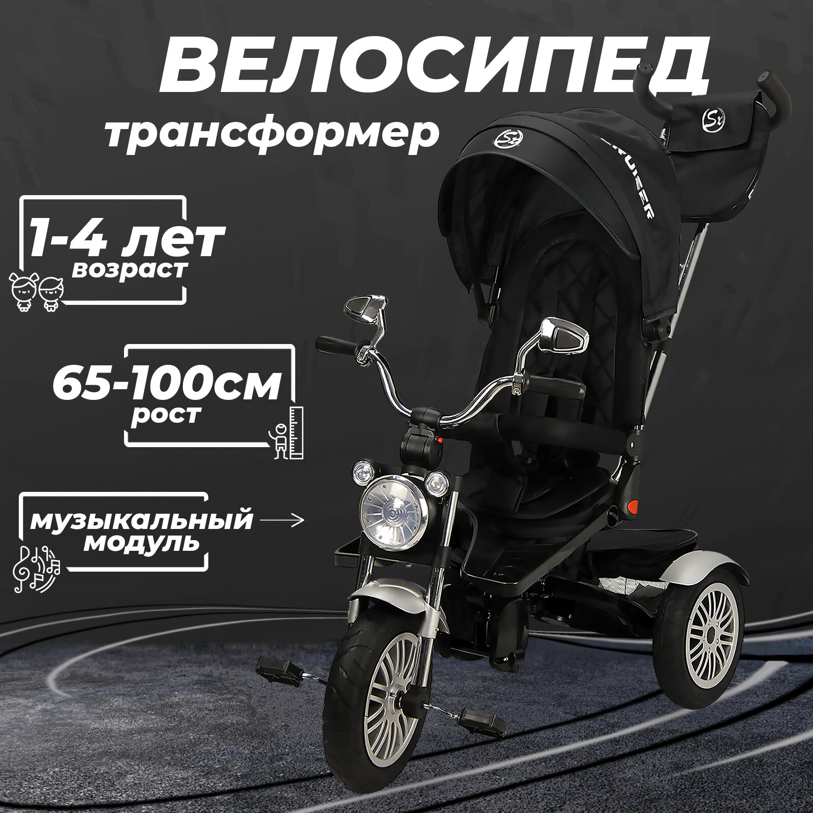 Велосипед трехколесный детский с ручкой и козырьком Cruiser, 1-4 года, черный интересное: