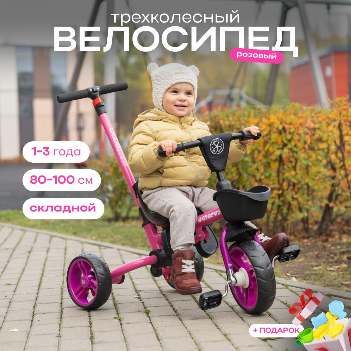 | Комплектация | Трёхколёсный складной велосипед OCTOPUS с Телескопической Родительской Ручкой, Подстаканником, Корзинкой, Подставкой для ног |