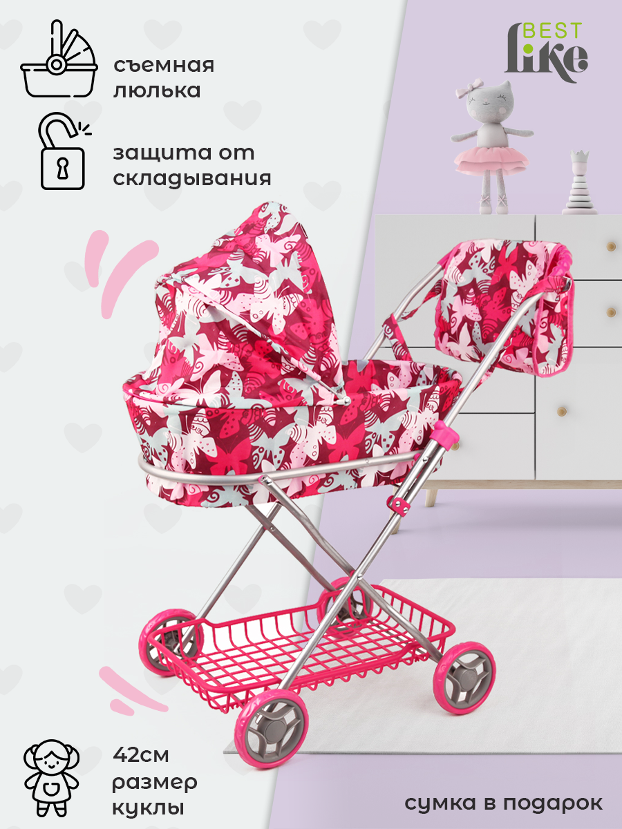 Коляска 9325 Melobo Люлька металлическая с сумкой и сеткой, розовая с бабочками интересное: