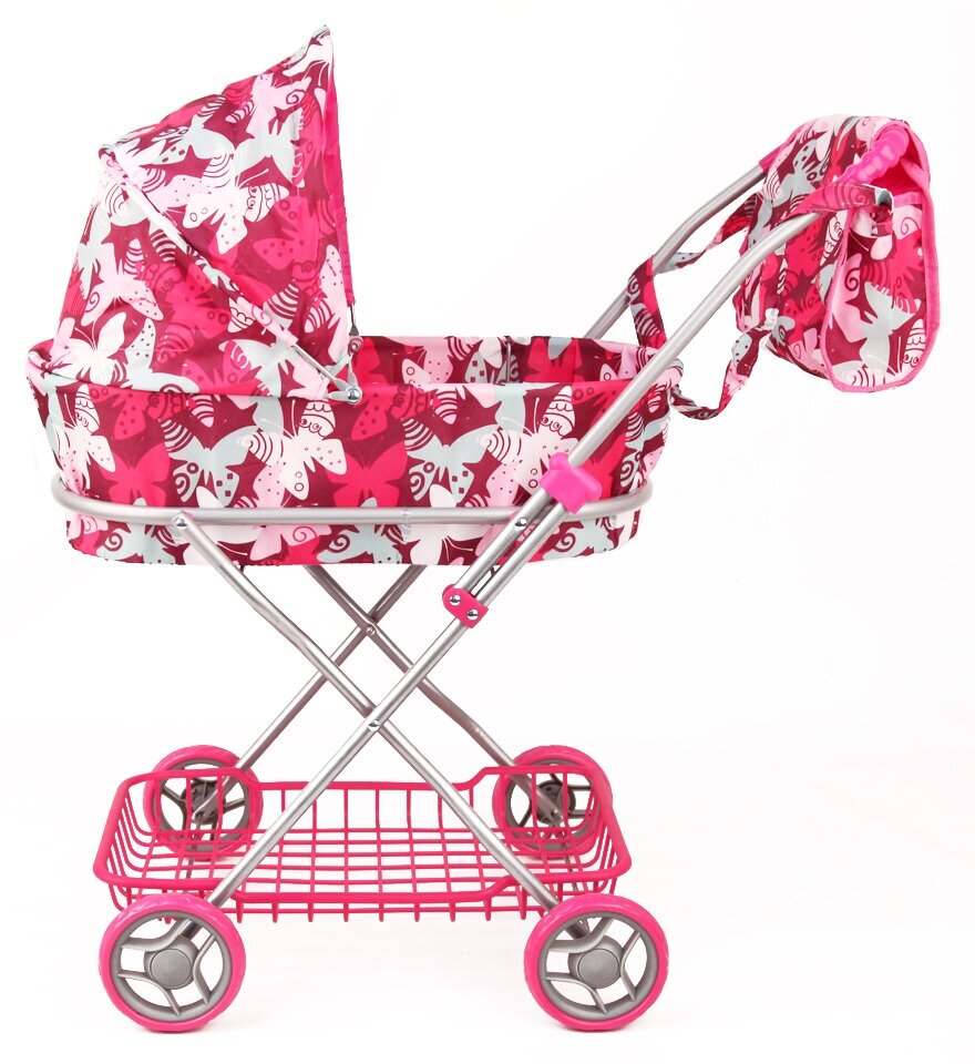 Купить Коляска 9325 Melobo Люлька металлическая с сумкой и сеткой, розовая с бабочками