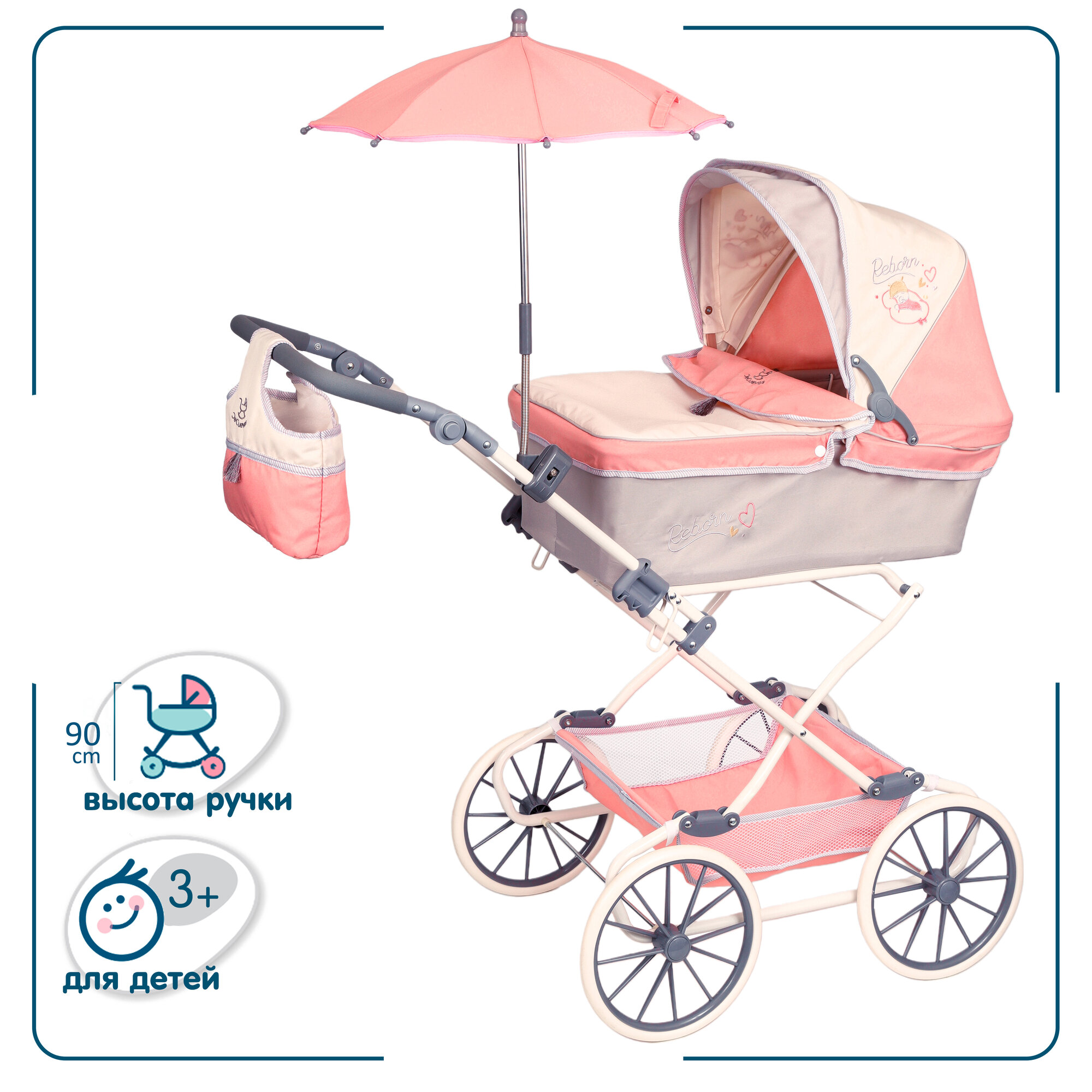 Коляска для кукол люлька Реборн с сумкой и зонтом, 90 см