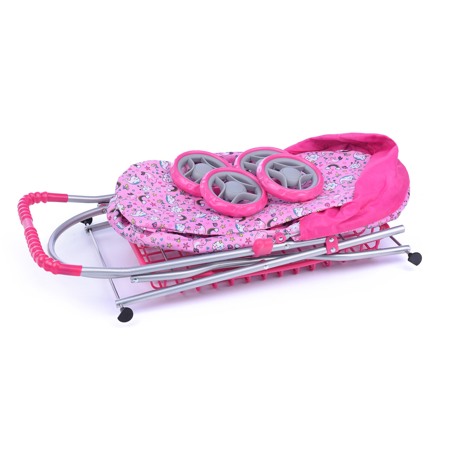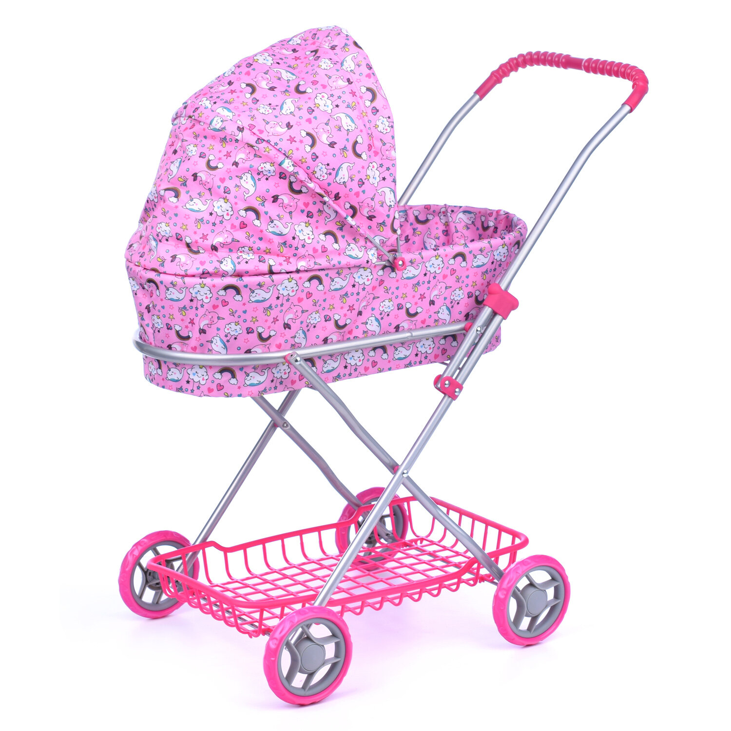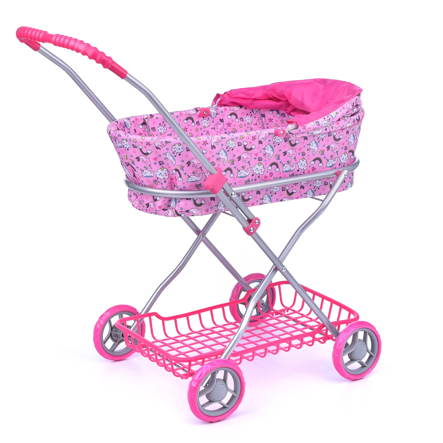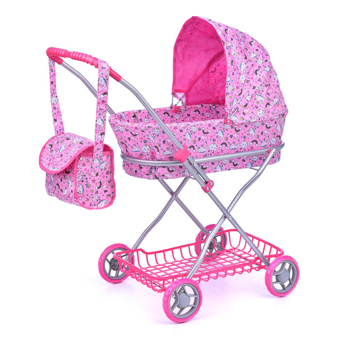 Коляска для кукол 9325, металлическая, складная, прогулочная c капюшоном, с сумкой и корзиной, цвет интересное: