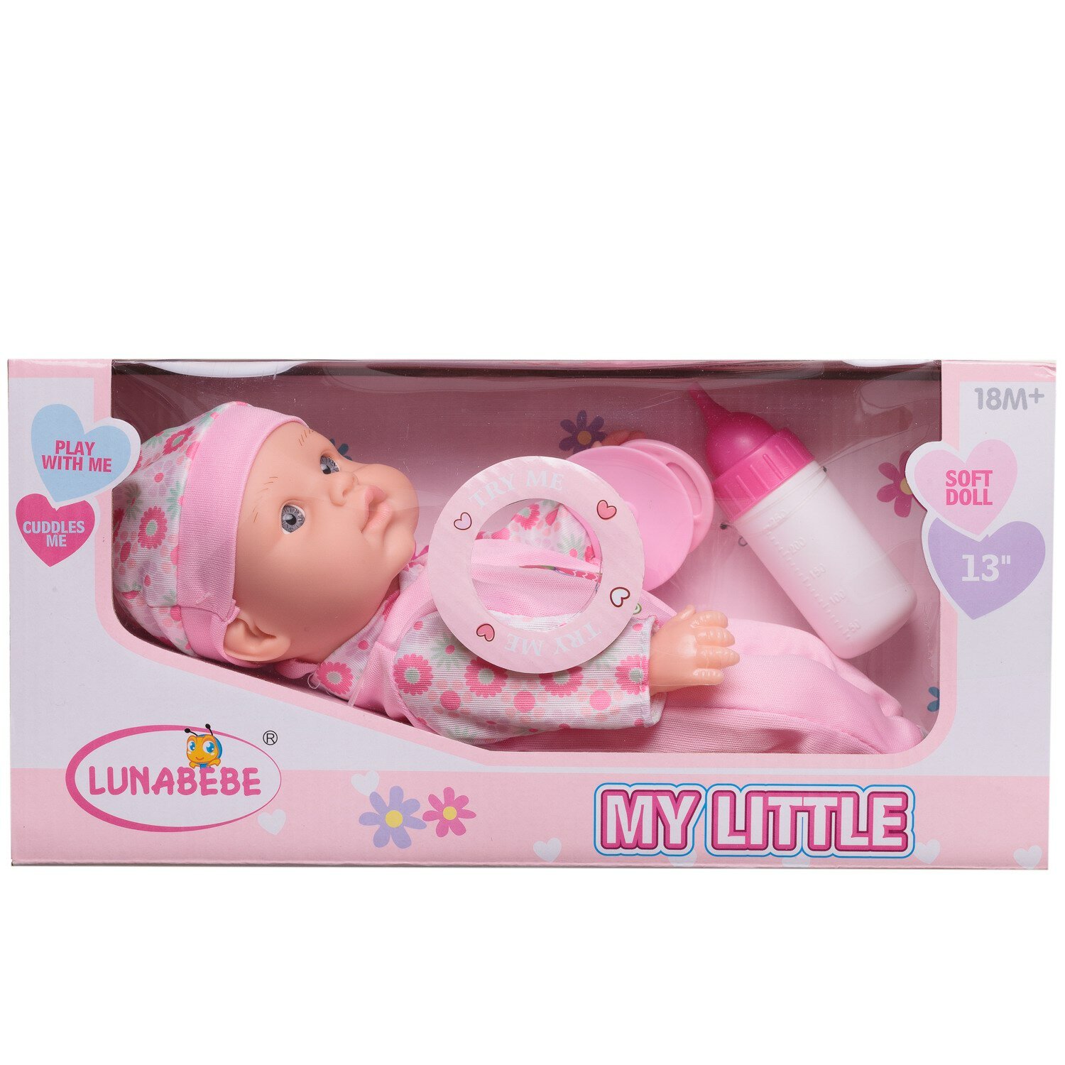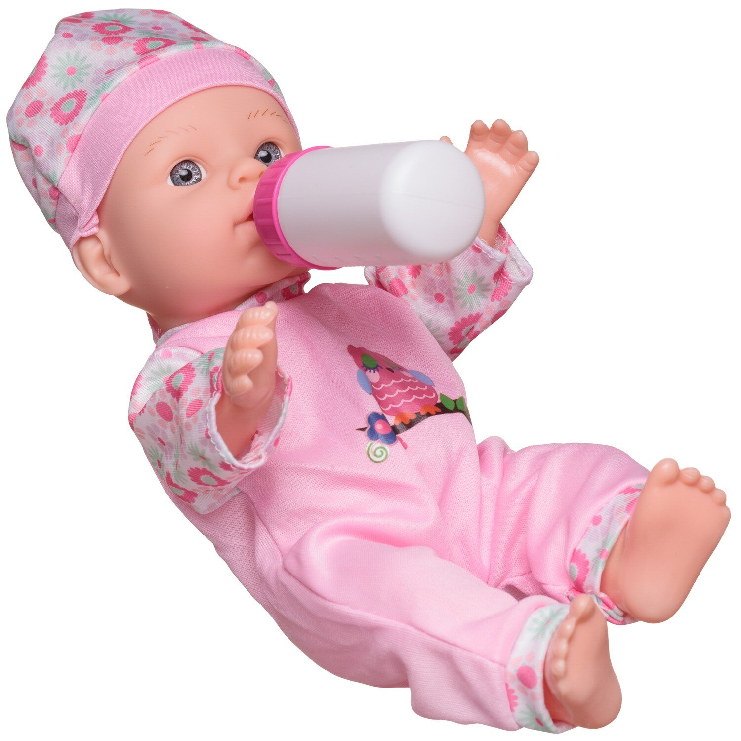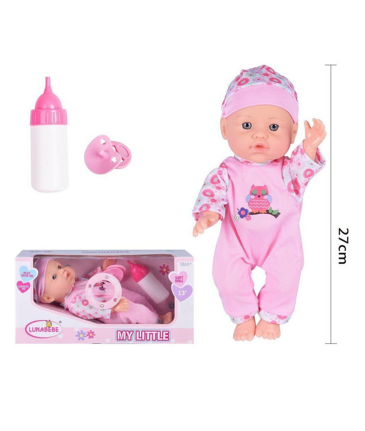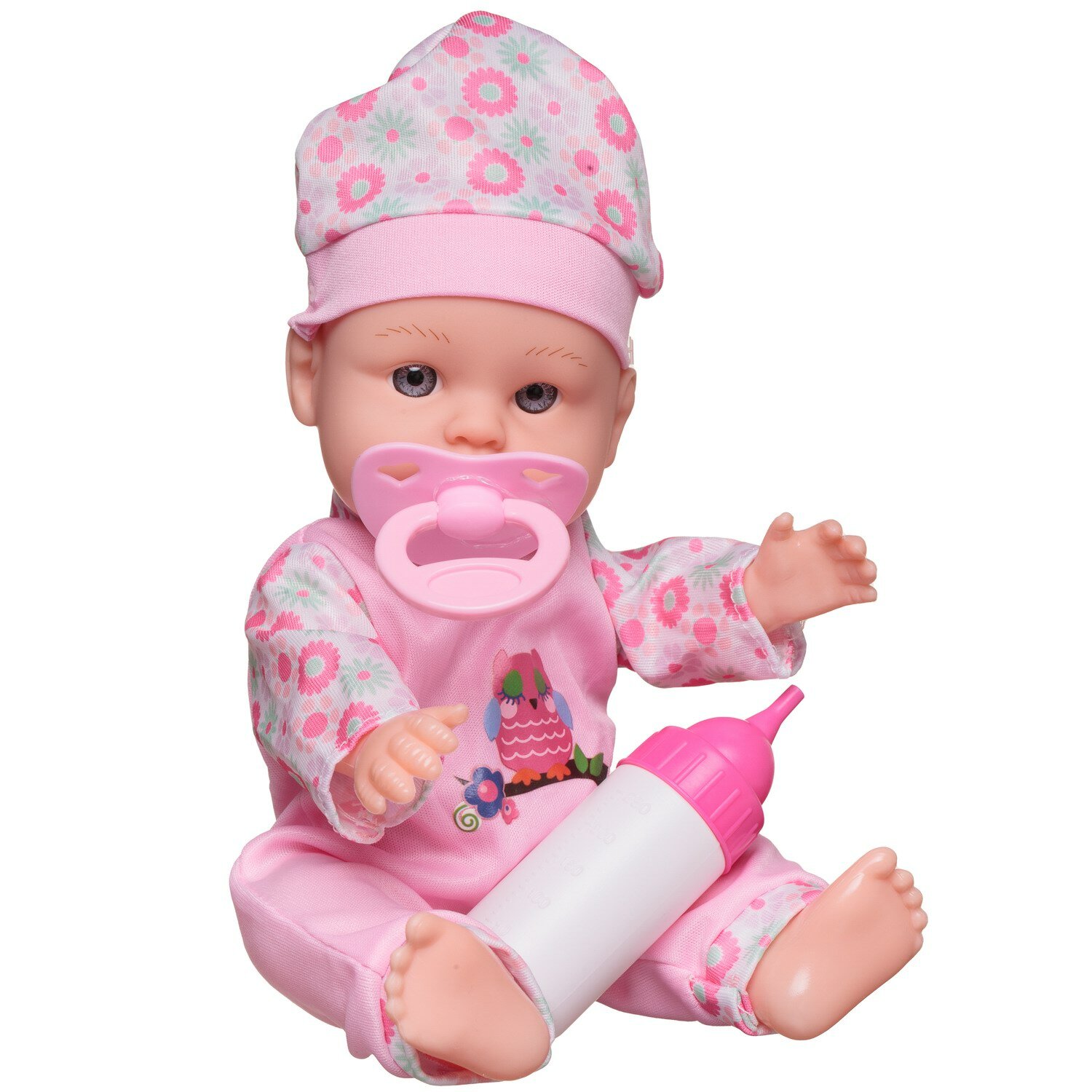 Купить Пупс Junfa "My Little", 27 см, озвученный, в розовом комбинезоне с изображением совенка, с бутылочкой и соской, в коробке