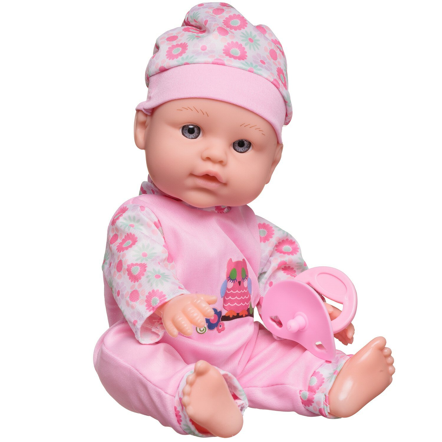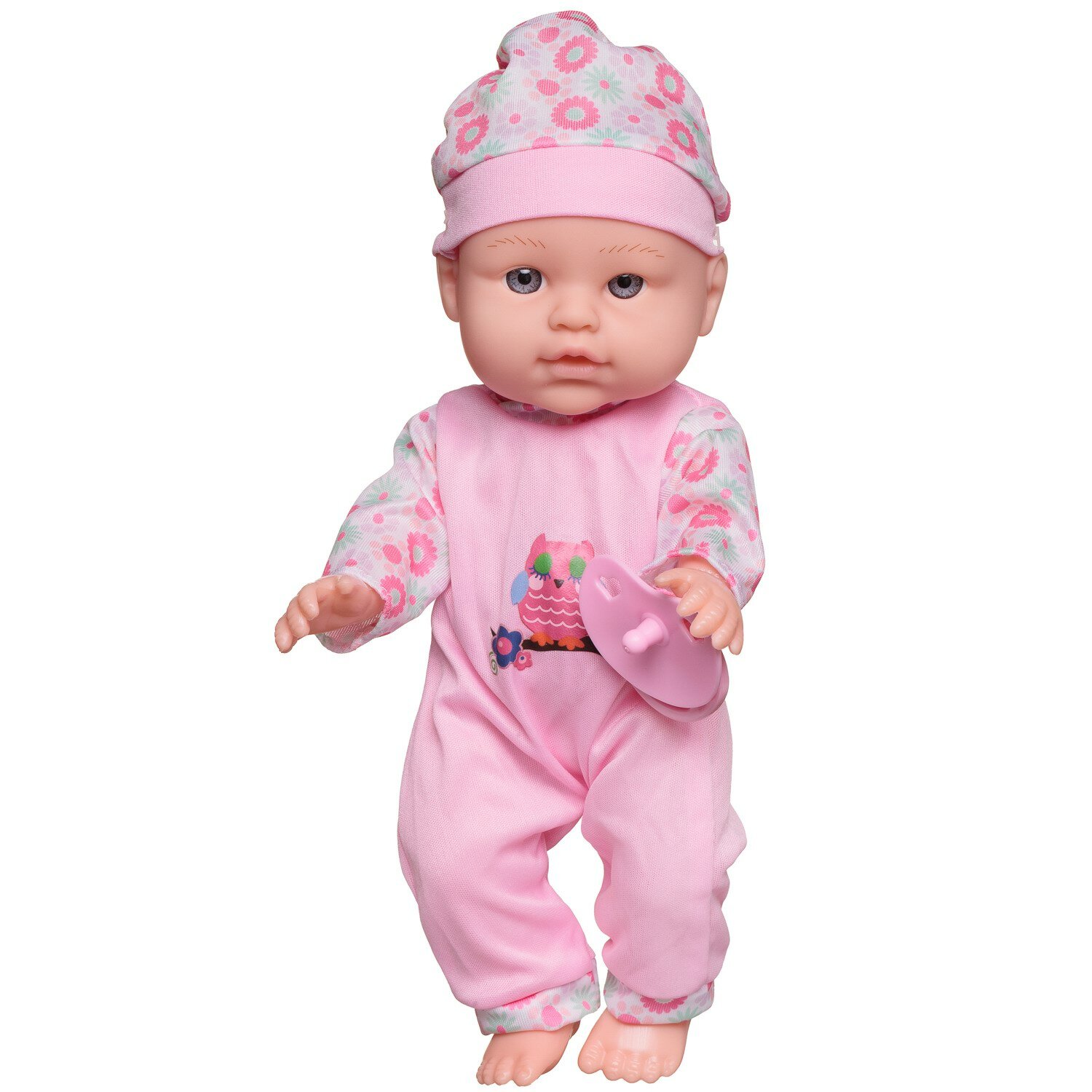 Пупс Junfa озвученный 27 см в розовом комбинезоне с изображением совенка, с бутылочкой и соской WJ-36373