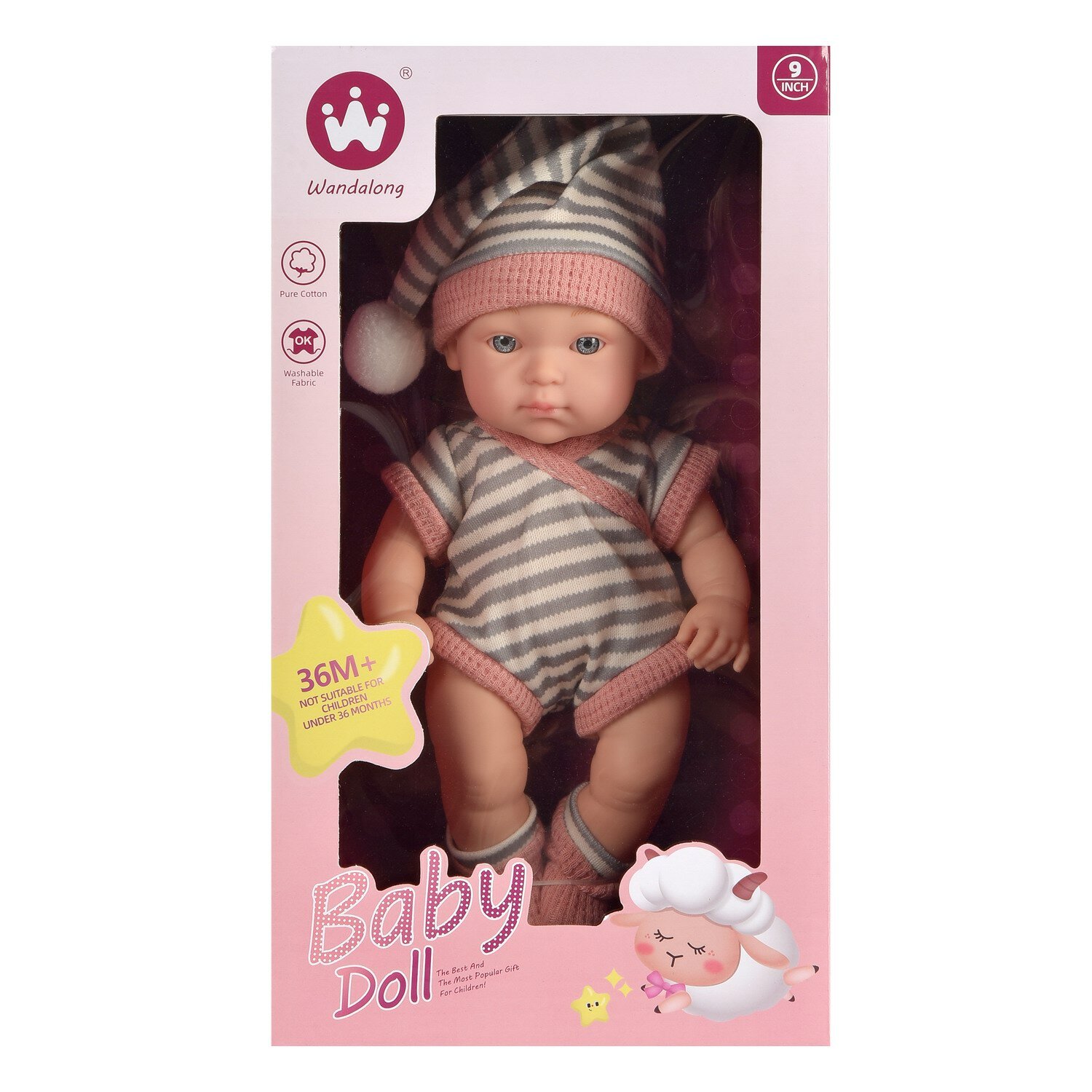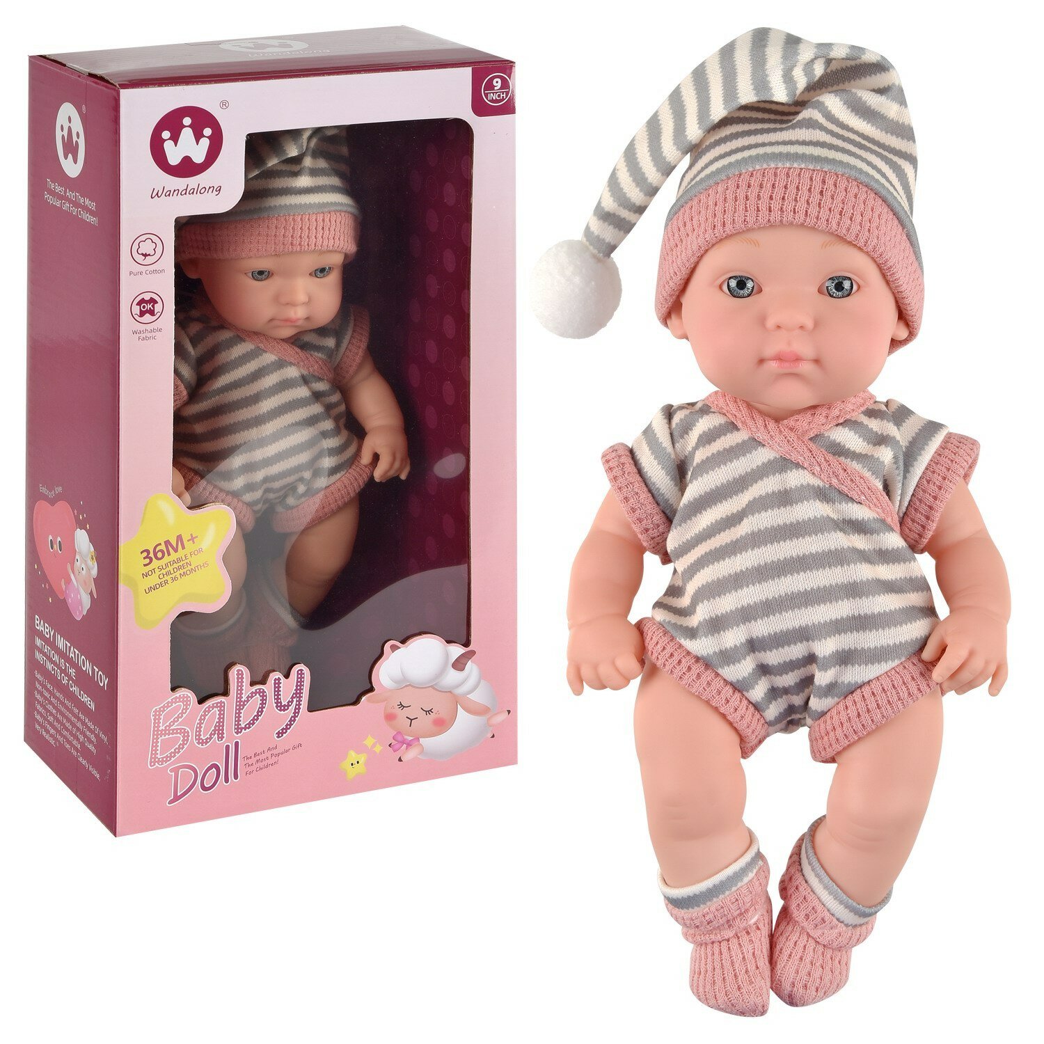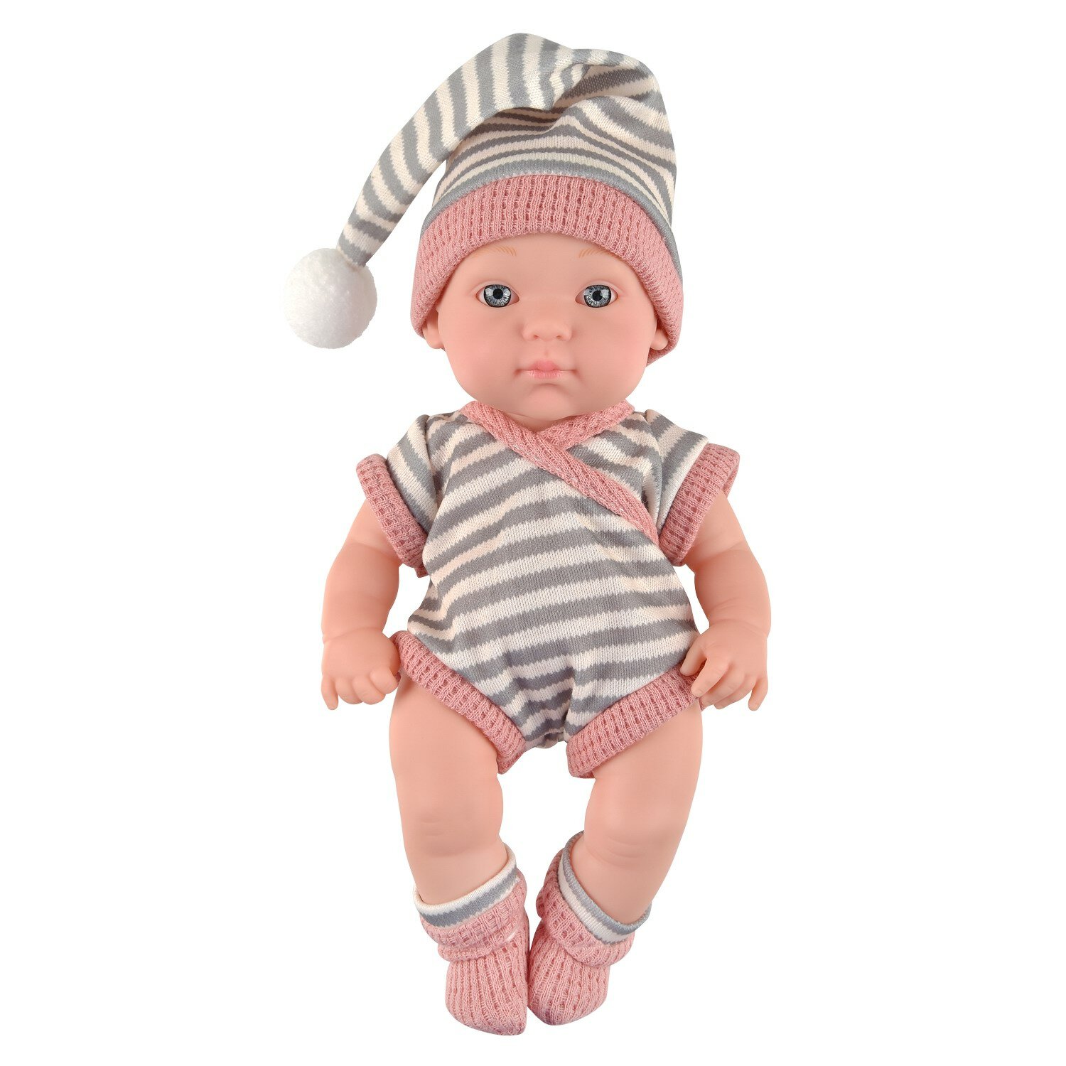 Пупс Junfa "Baby Doll", 23 см, в полосатых боди, носочках, шапочке-колпаке, в коробке