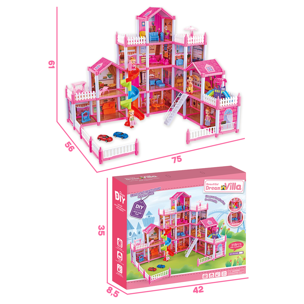 | Подробная комплектация | Кукольный домик, кукла 2шт, машинка 2 шт, горка 2 шт, лестница, качель 2 шт, кухонный гарнитур, шезлонг, холодильник, стул 3шт, стол, кровать, тумбочка, шкаф, музыкальный центр, кресла 2 шт, столик кофейный, диван, рояль, часы. |