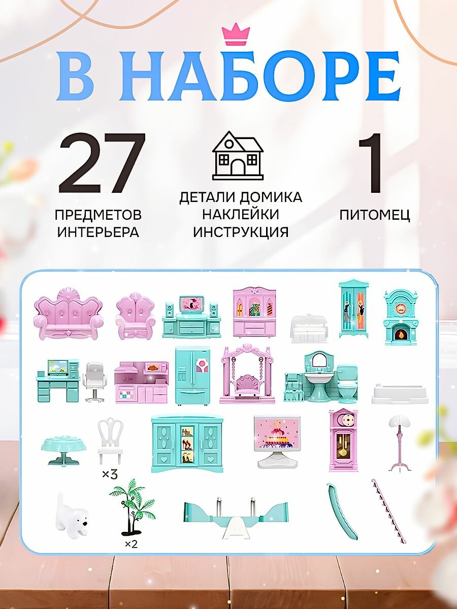 | Подробная комплектация | домик, мебель, аксессуары, питомец |