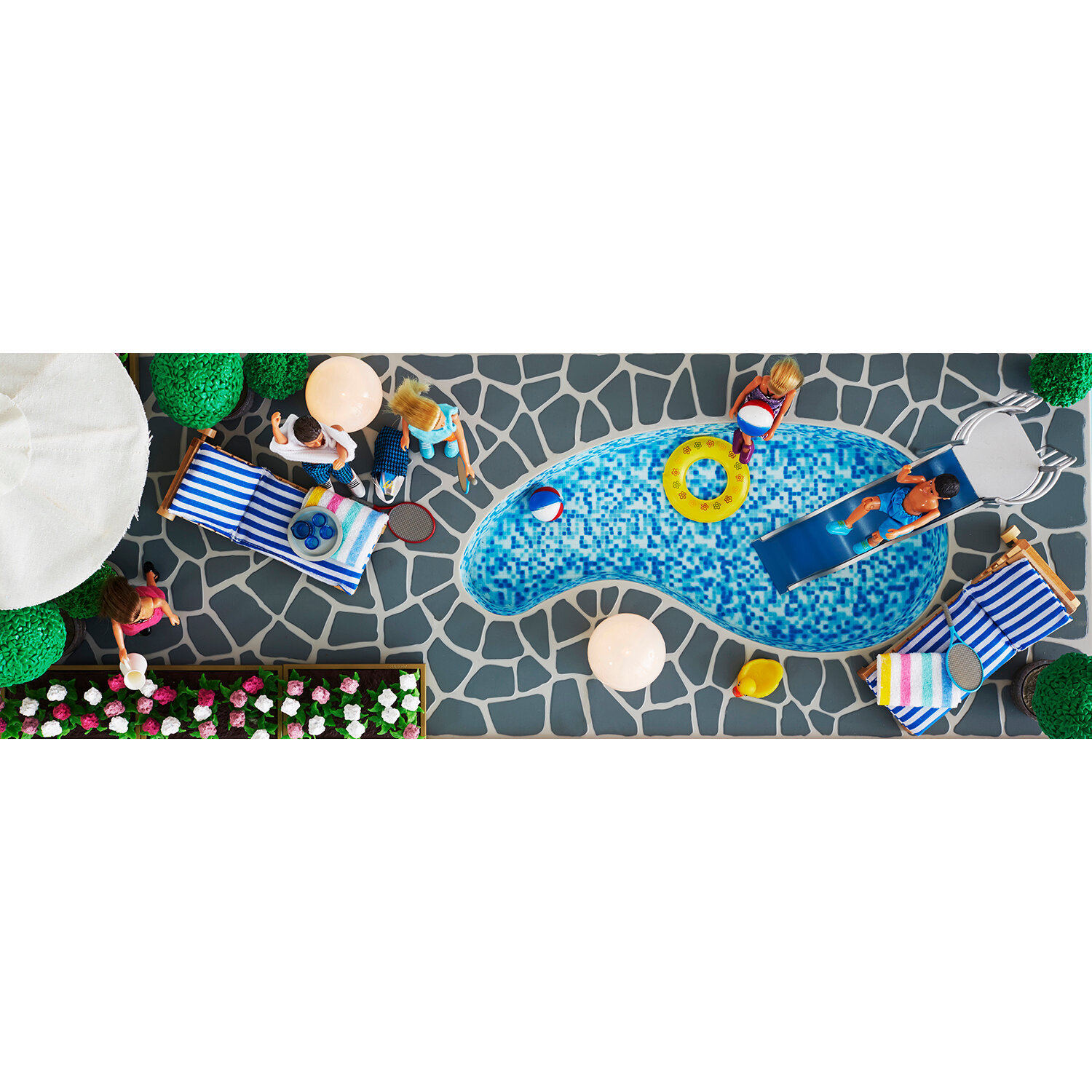 | Дополнительная информация | просторный балкон, патио на крыше и выдвигающийся бассейн, в который можно наливать воду; электрическая разводка для подключения света; куклы и мебель в комплект не входят; |