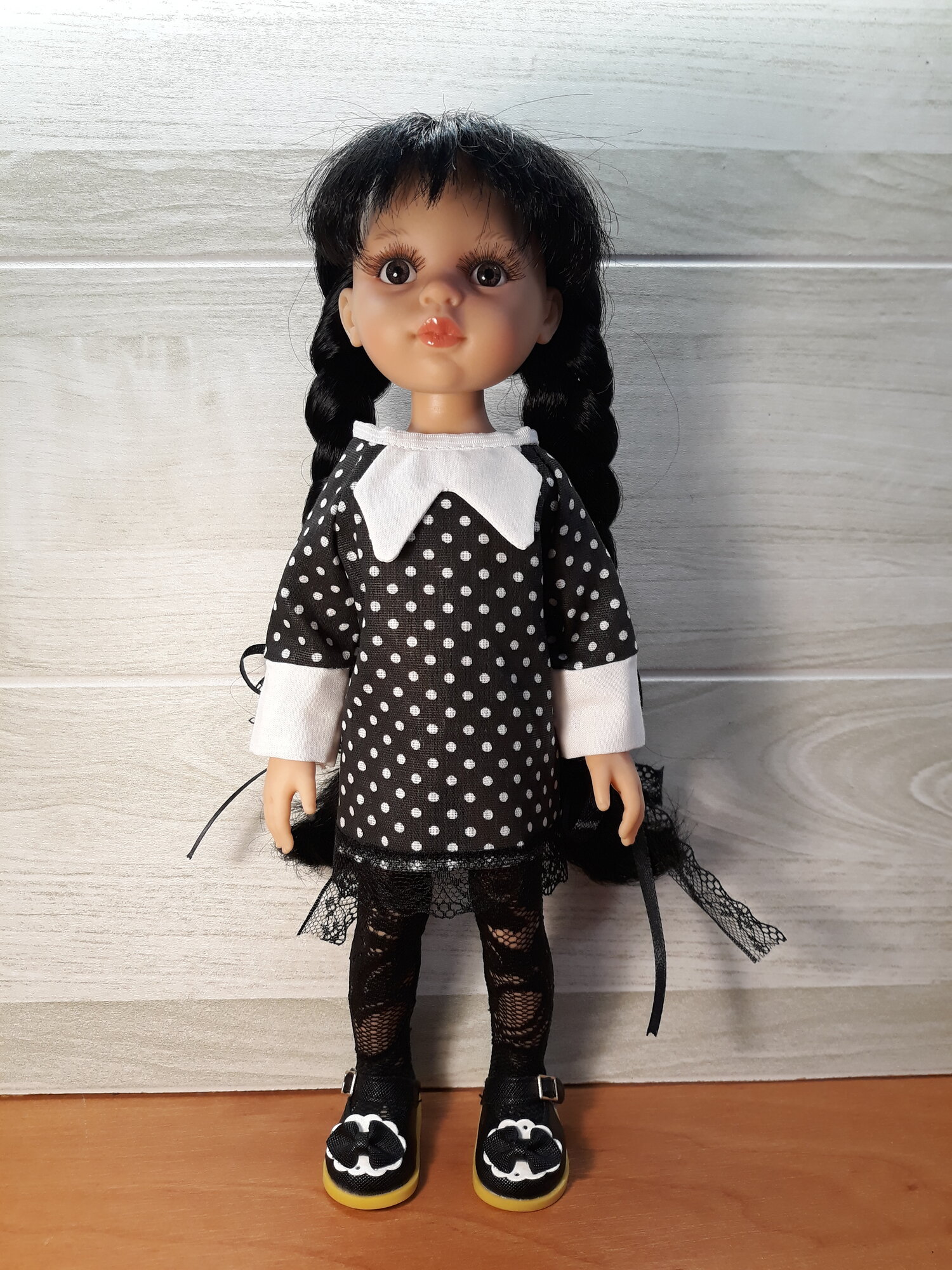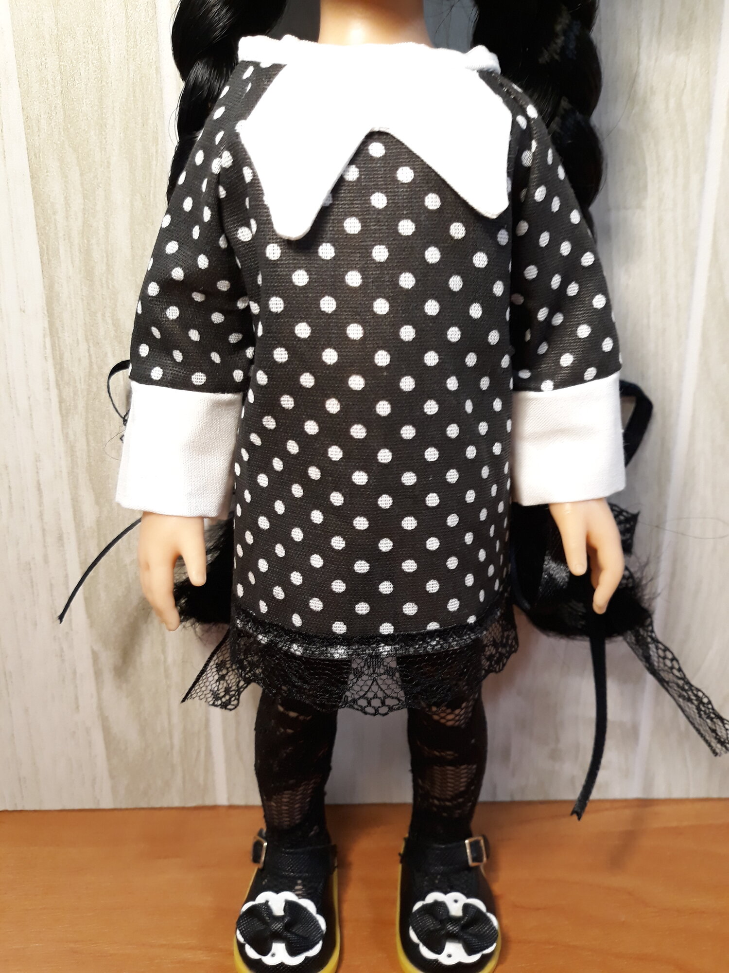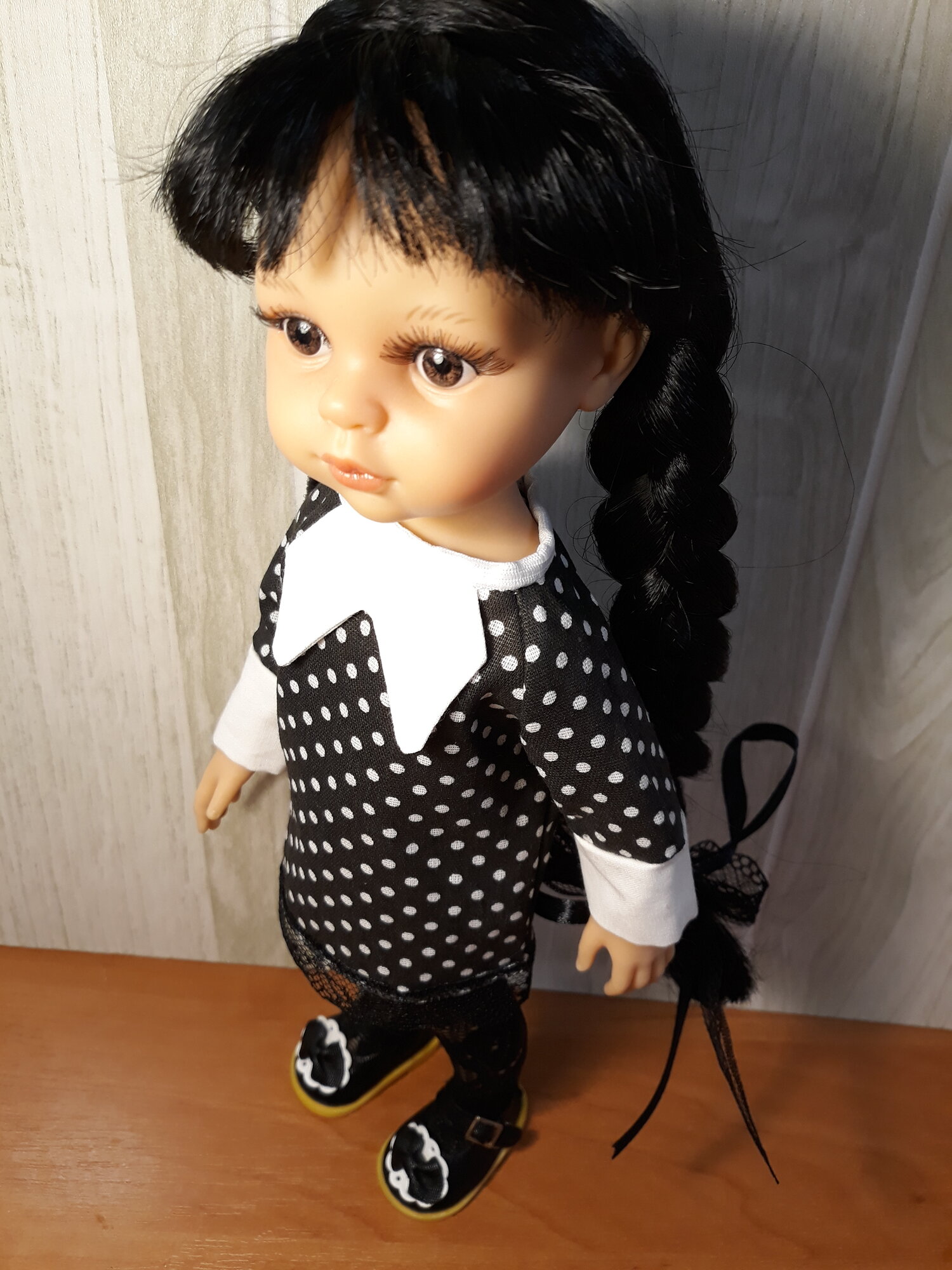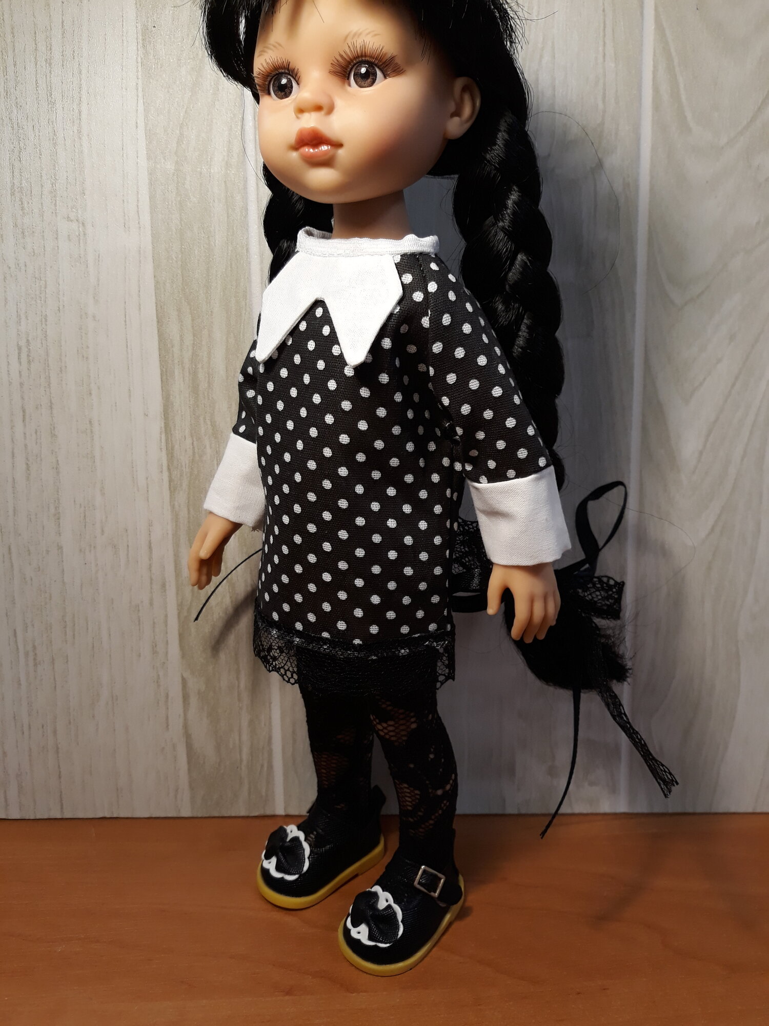 СохранитьПлатье для Паола Рейна Уенсдей прямое черное с обувью, чулками и бантики интересное: