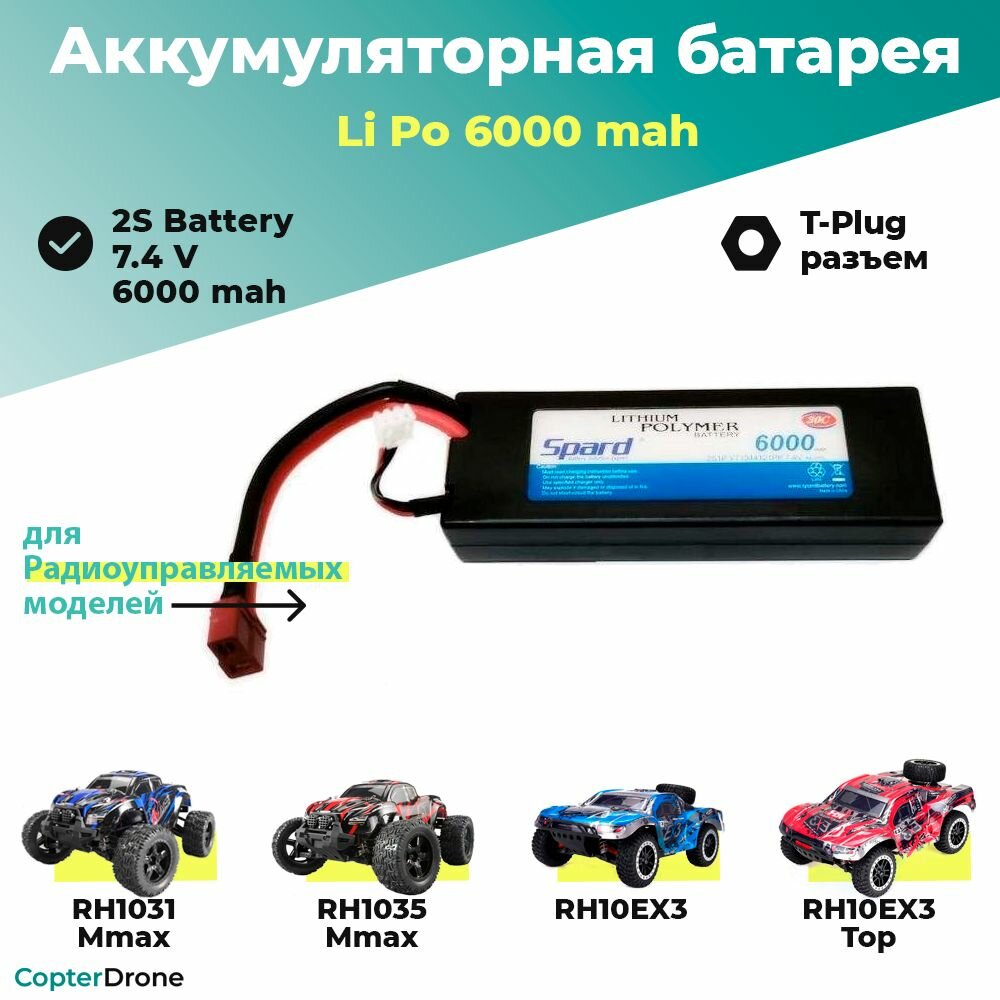 Аккумулятор Spard Li-Po 6000 mAh, 7.4V, 30C, T‐plug для Remo Hobby и Himoto 1/10, 1/8