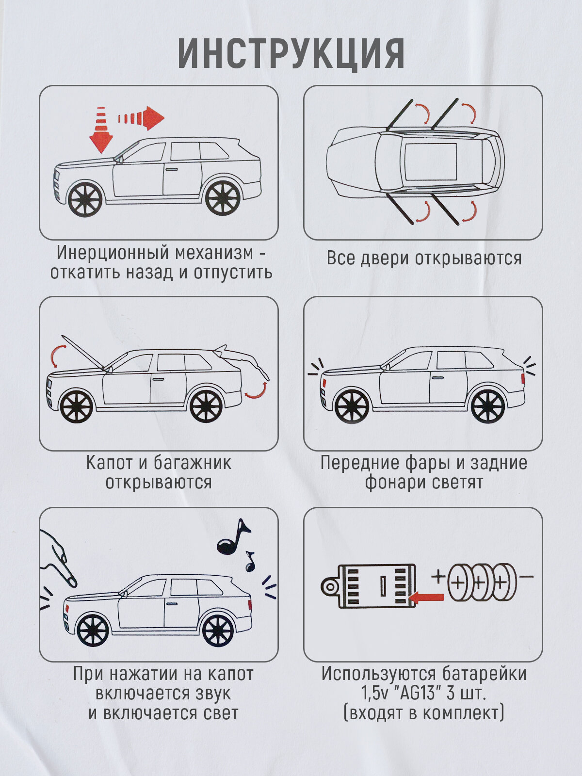 | Особенности | батарейки в комплекте / коллекционная / открывается капот/багажник / открываются дверцы / звук / свет |