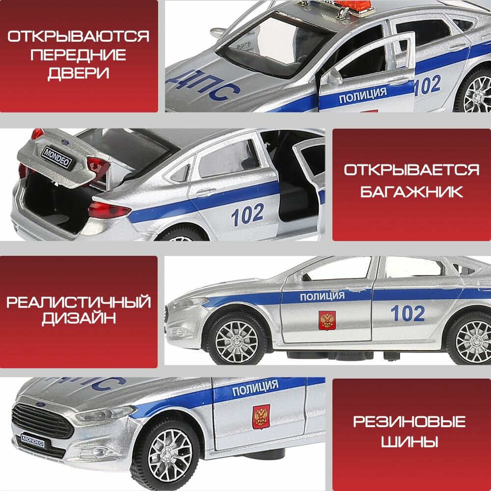 Машинка детская Ford Mondeo Полиция 12 см, Технопарк, серебристая, открываются двери и багажник, металлический корпус