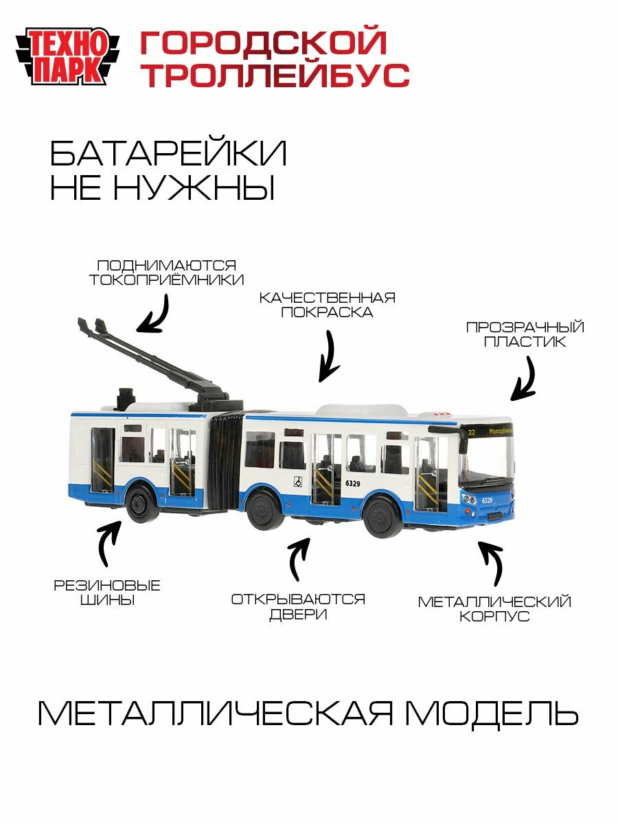 Машинка игрушка детская для мальчика Городской троллейбус Технопарк модель металлическая коллекционная инерционная с открывающимися дверьми 19 см