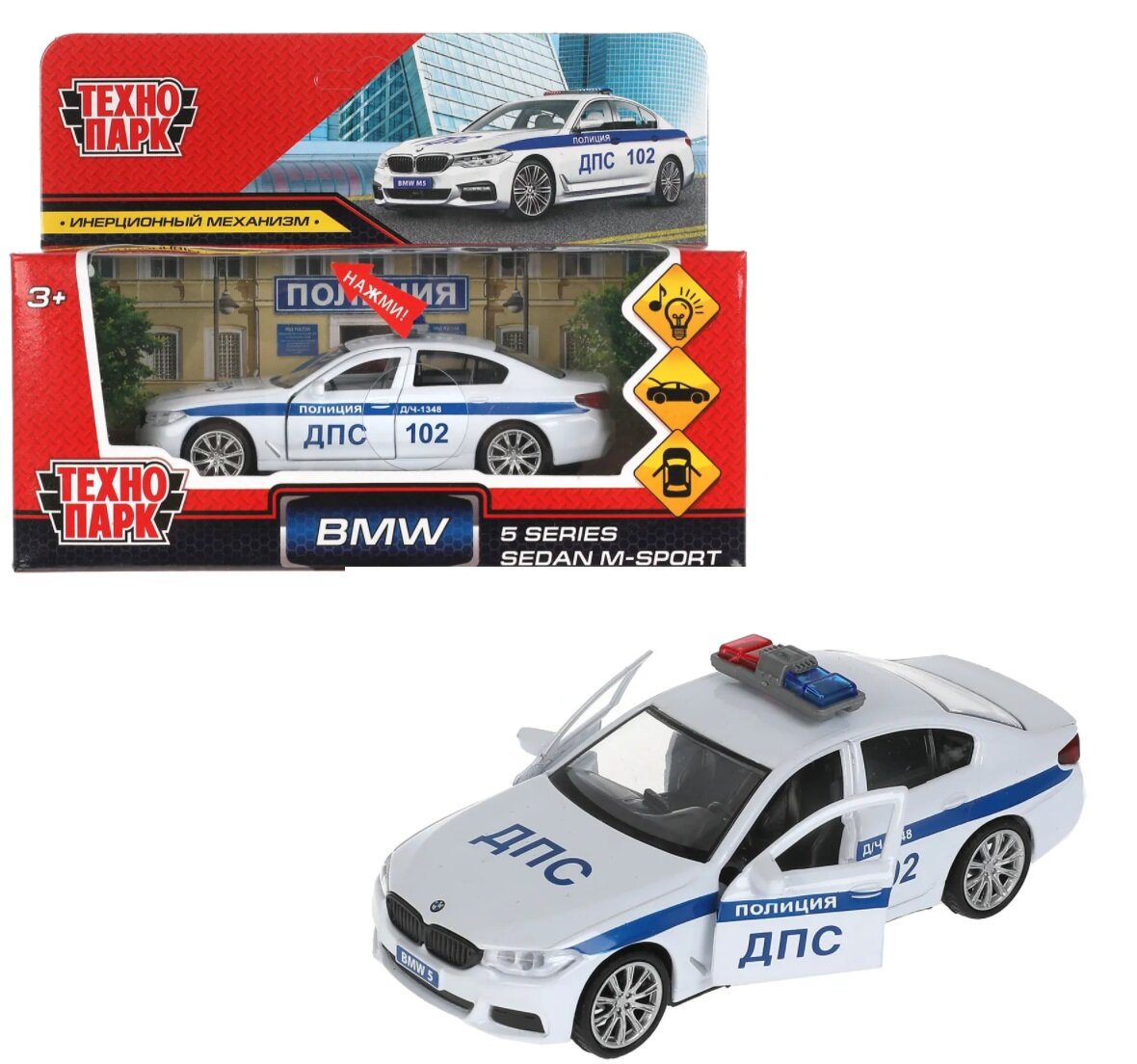 Модель машины Технопарк BMW 5 series sedan M Sport, Полиция, белая, инерционная, свет, звук 5ER-12SLPOL-WH