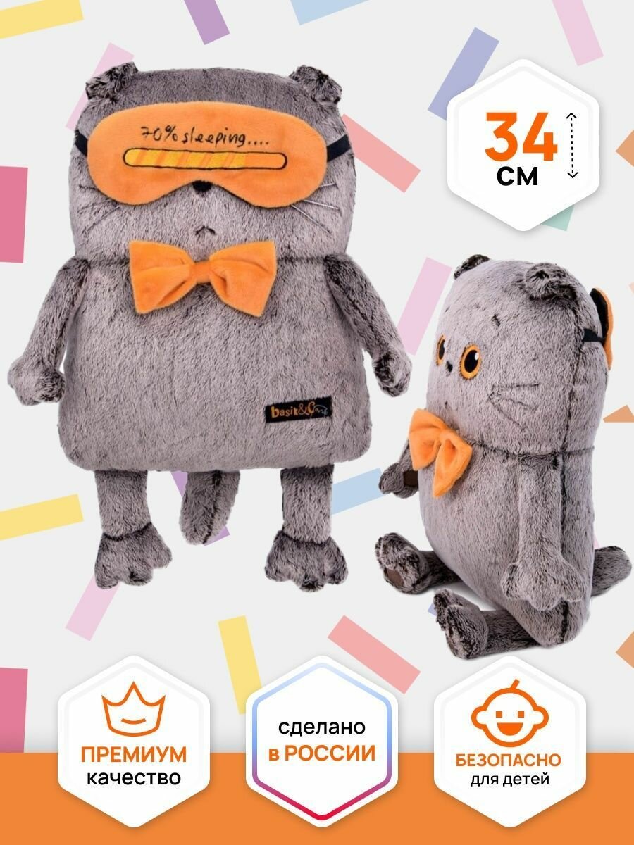 Дорожная подушка игрушка Кот Басик в маске для сна 34 см