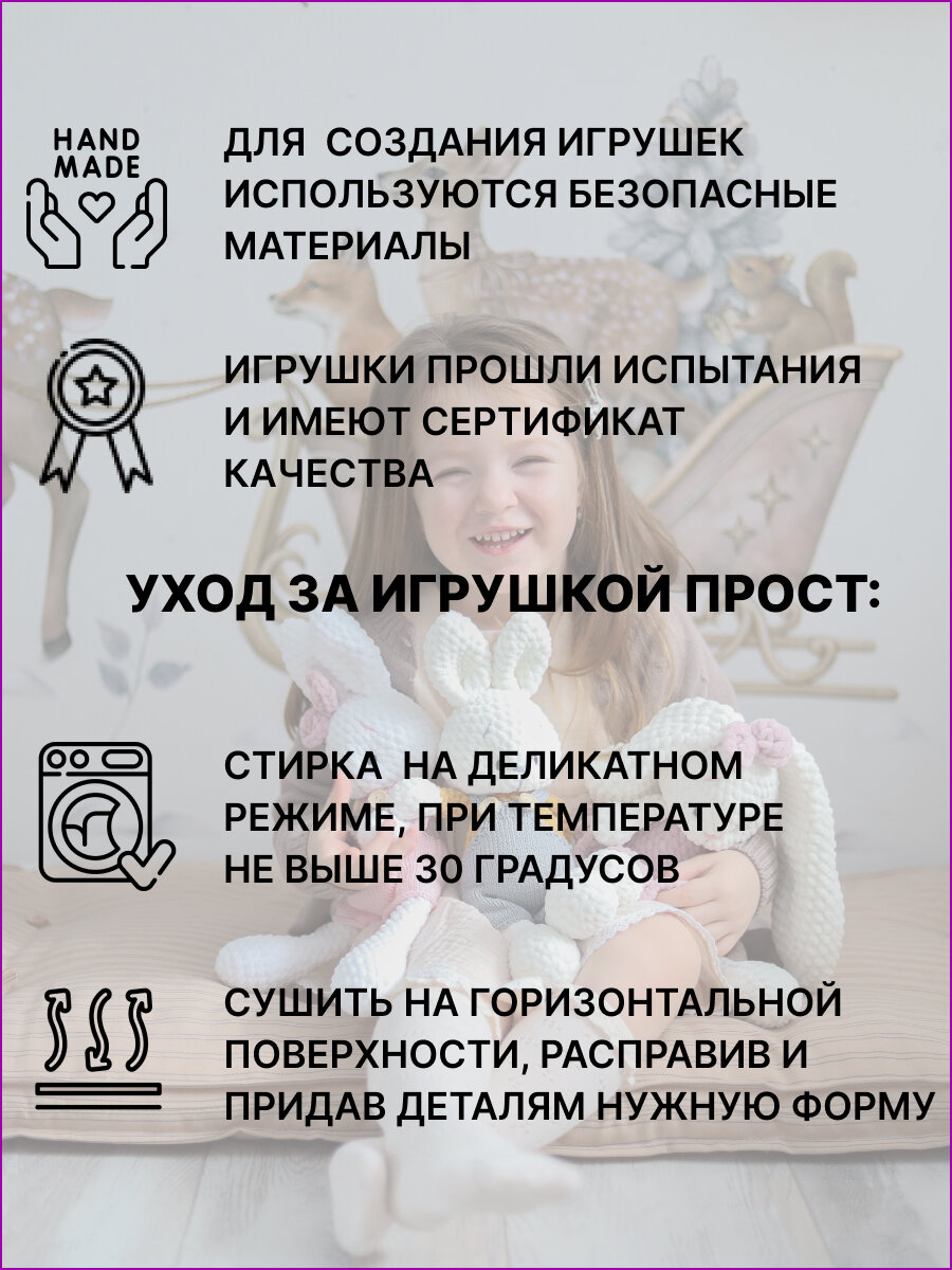 | Дополнительная информация | амигуруми, вязанная игрушка, зайка игрушка, декор детской. детская игрушка, игрушка для сна, подарок |