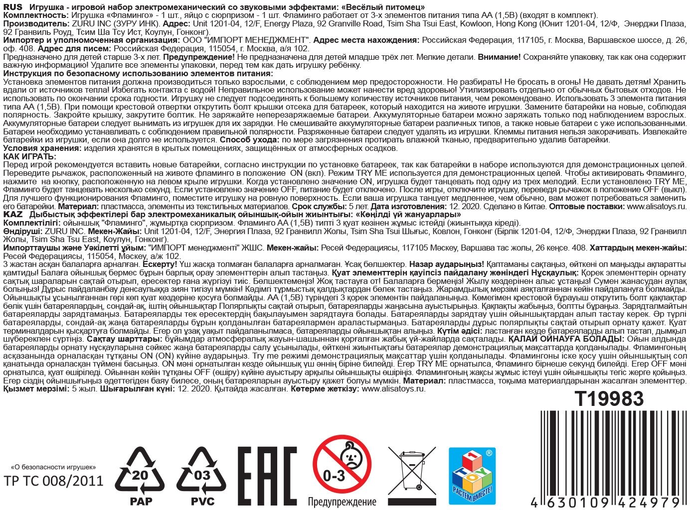 | Дополнительная информация | фламинго: 1 фламинго, 1 яйцо-сюрприз, 1 маленькая фигурка фламинго, танцует под 3 зажигательные мелодии, двигает шеей, машет крыльями; ленивец: высота 26 см |