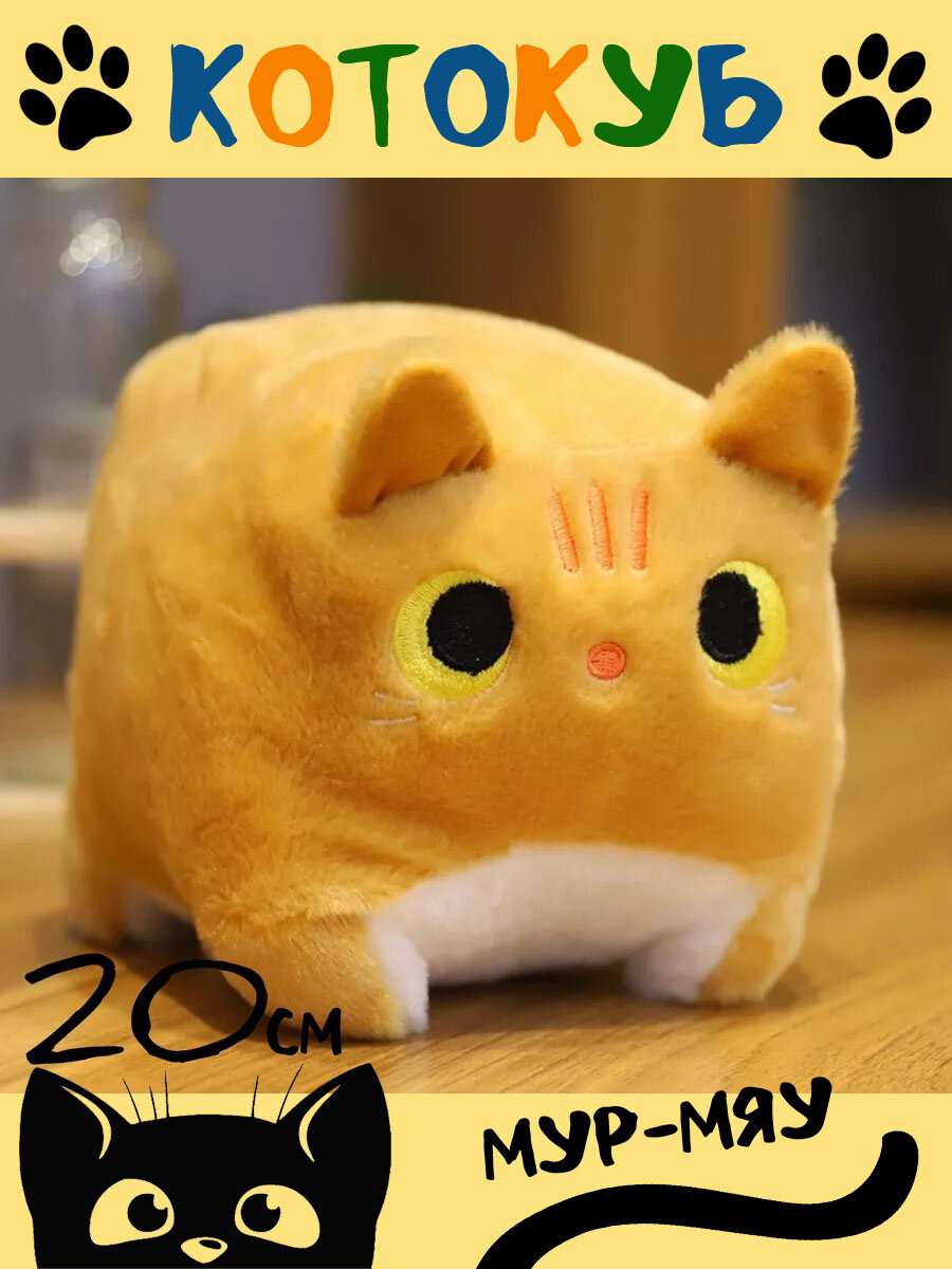 Мягкая игрушка-подушка глазастый квадратный Котокуб 20 см, рыжий