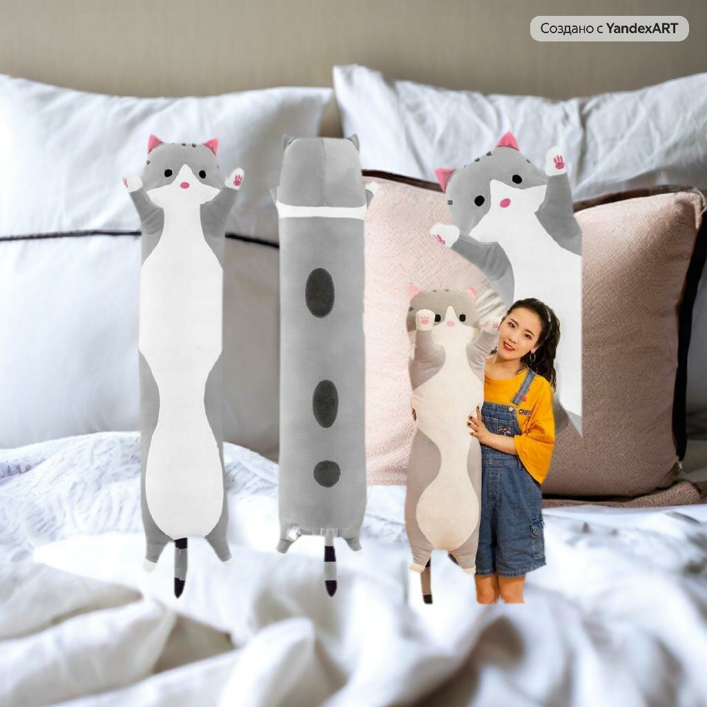 Мягкая игрушка кот-батон 90 см, серый\длинная подушка-обнимашка\большая кошка, игрушка-антистресс