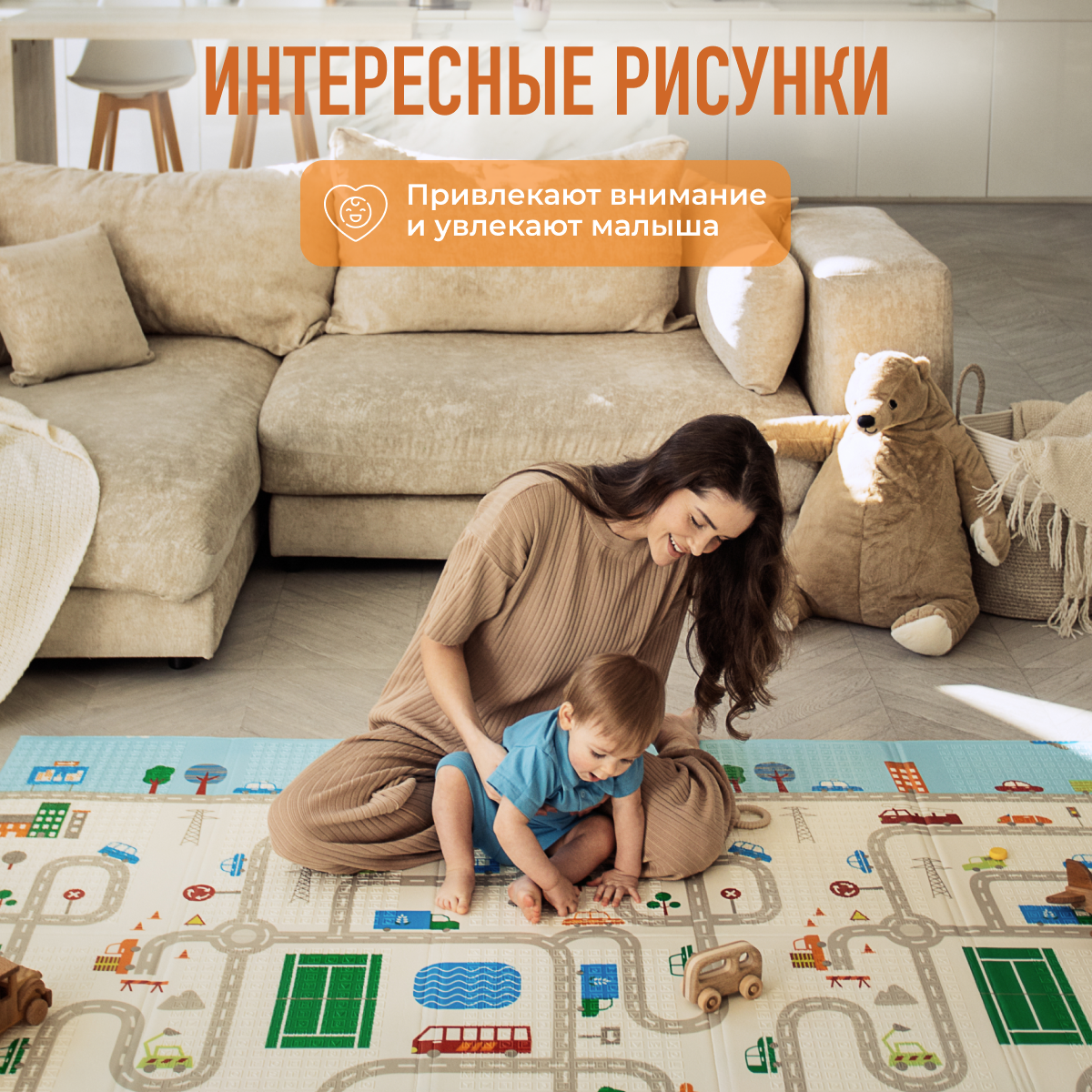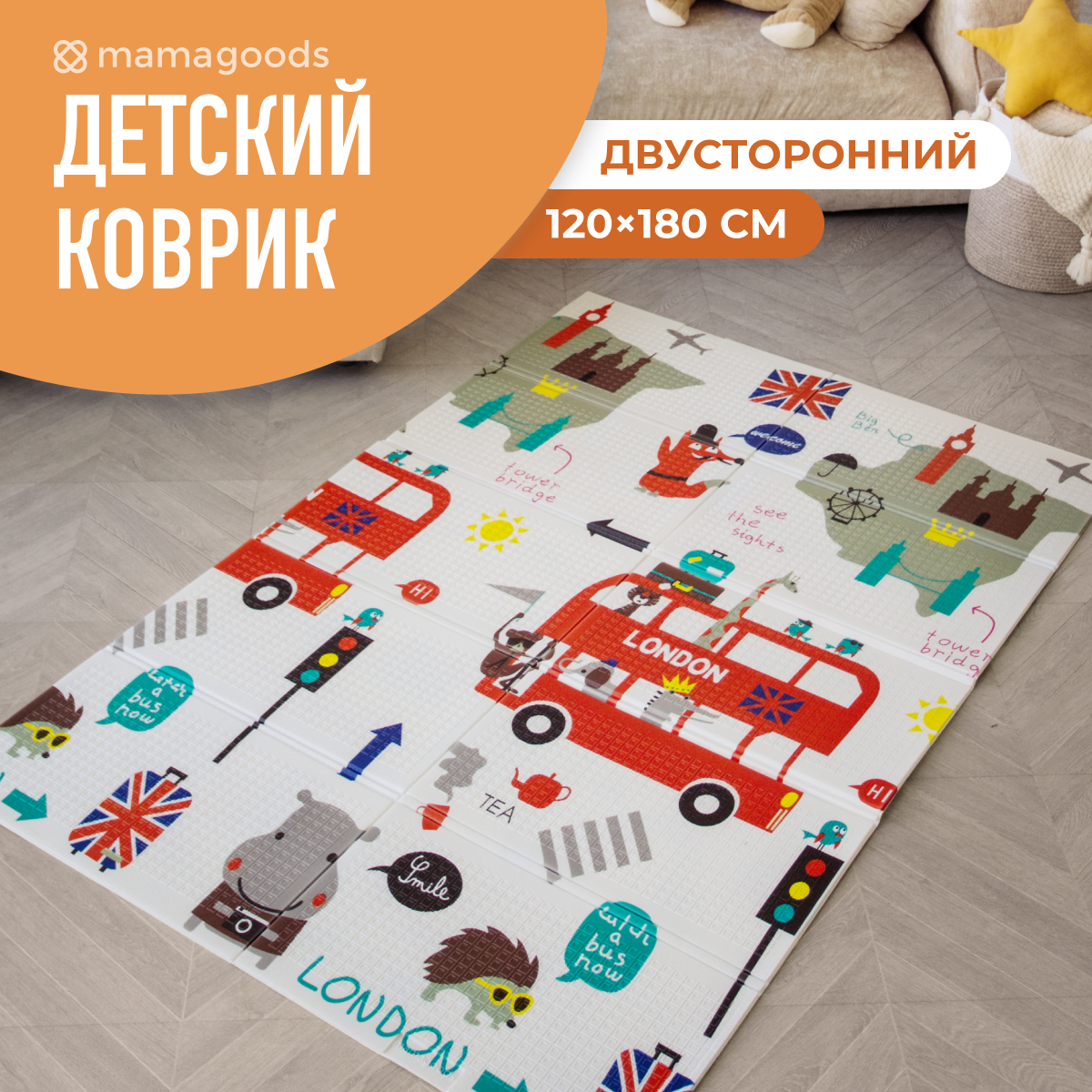 СохранитьДетский коврик для ползания складной двухсторонний игровой термоковрик Mamagoods 120 х 180 "Город и Лондонский автобус" интересное: