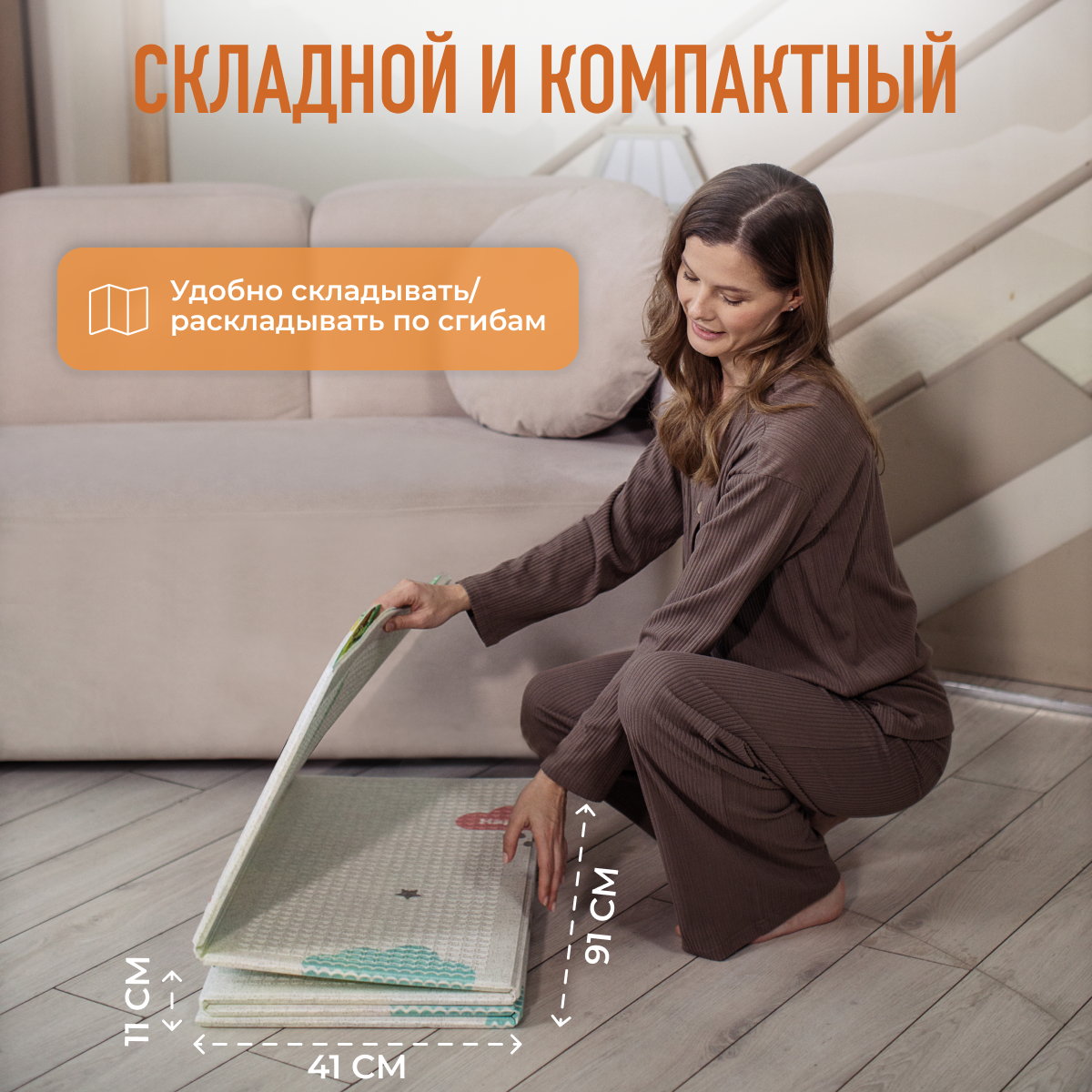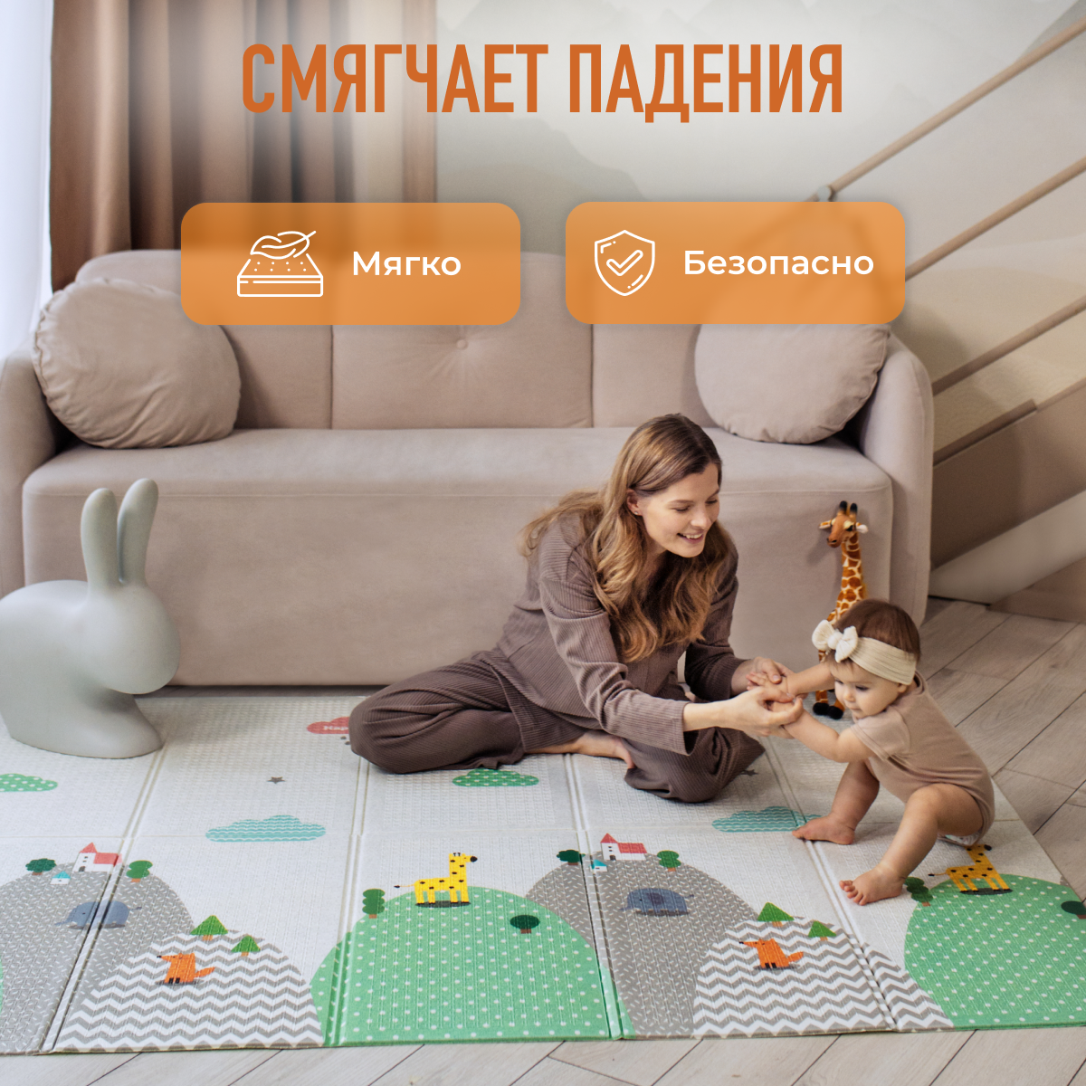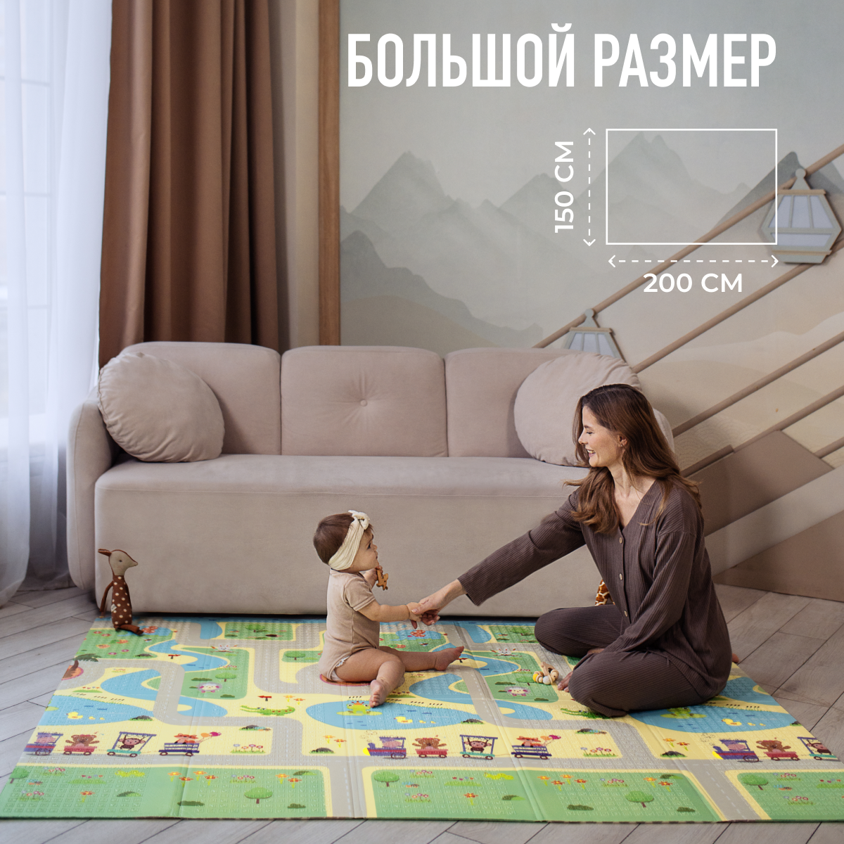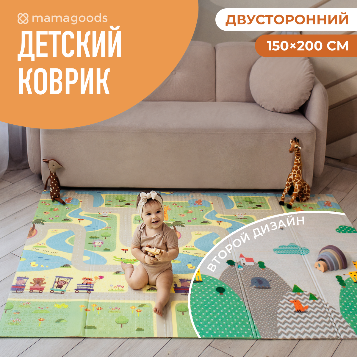Развивающий коврик детский Mamagoods для ползания складной игровой 150х200 см Холмы и Зверюшки интересное: