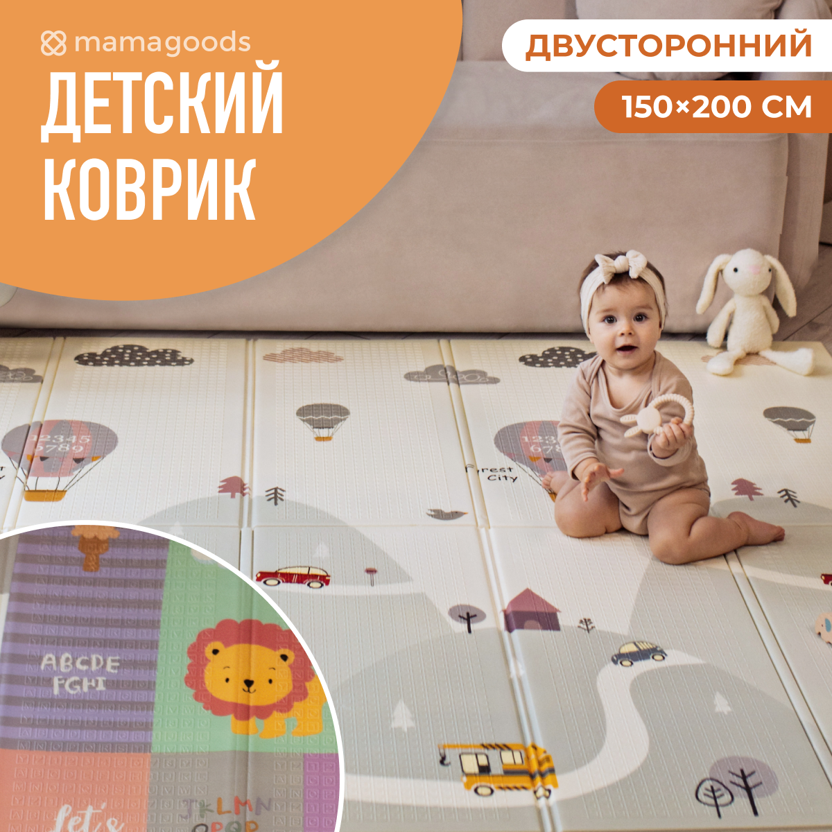 Детский коврик для ползания складной двухсторонний игровой термоковрик Mamagoods 150 х 200 Животные и жираф