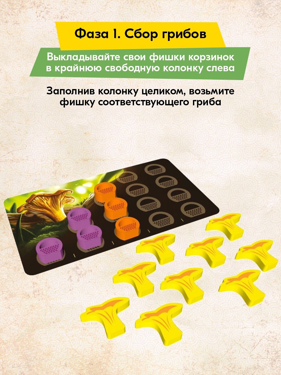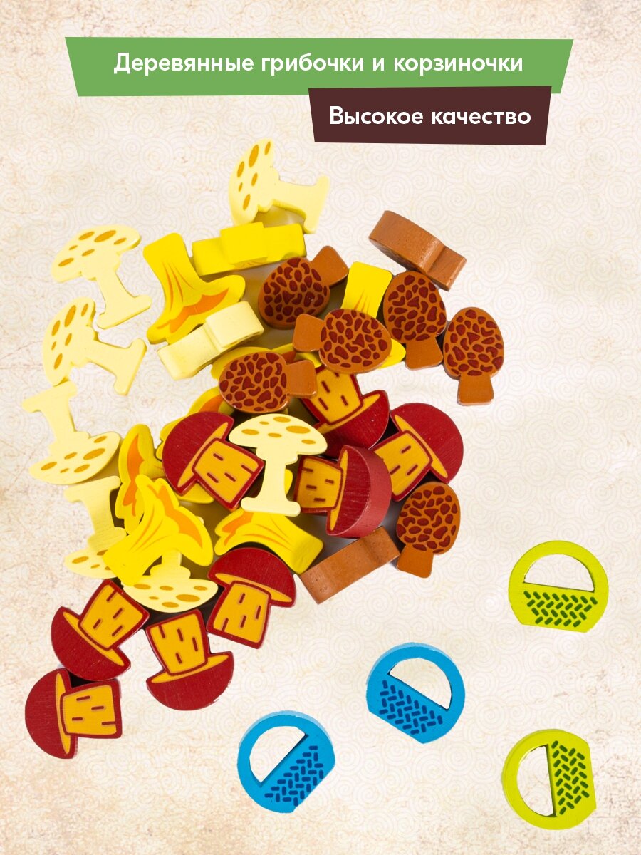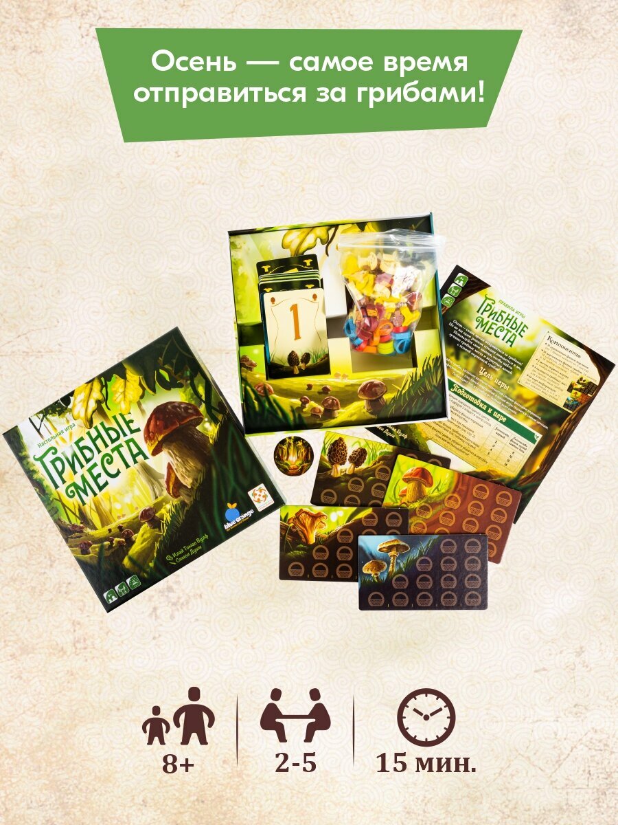 | Комплектация | В состав игры Грибные места входит: 35 деревянных фишек корзинок; 56 деревянных фишек грибов: 14 лисичек, 14 сморчков, 14 белых грибов и 14 грибов-зонтиков; 1 жетон первого игрока (с изображением леса); 4 планшета грибных мест; 16 карт информации, правила игры. |
