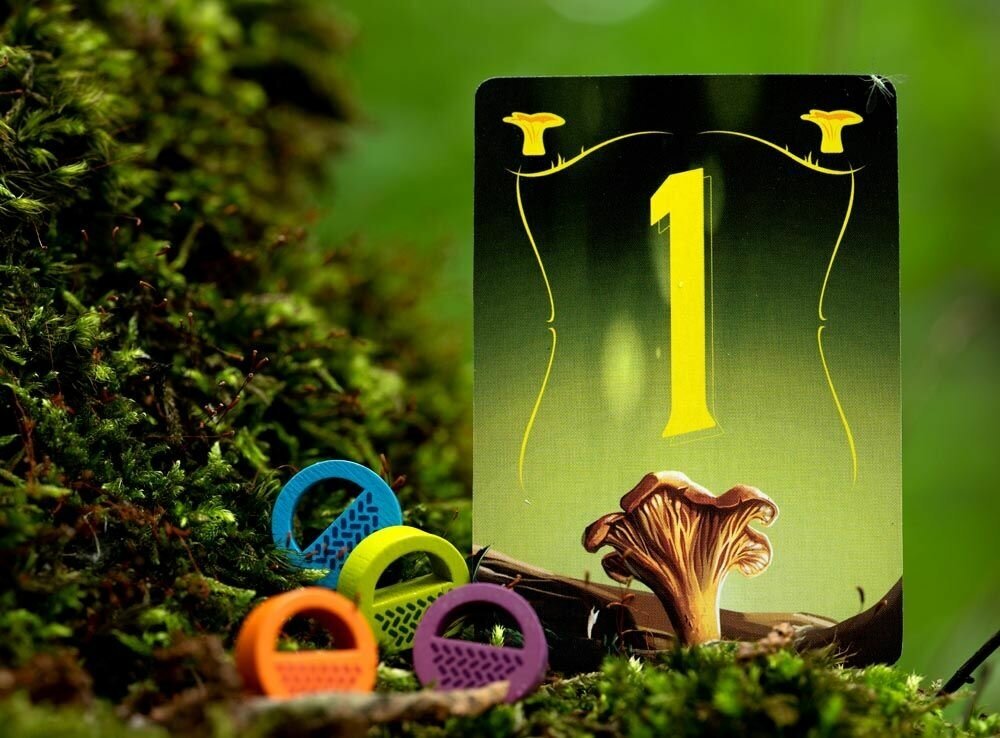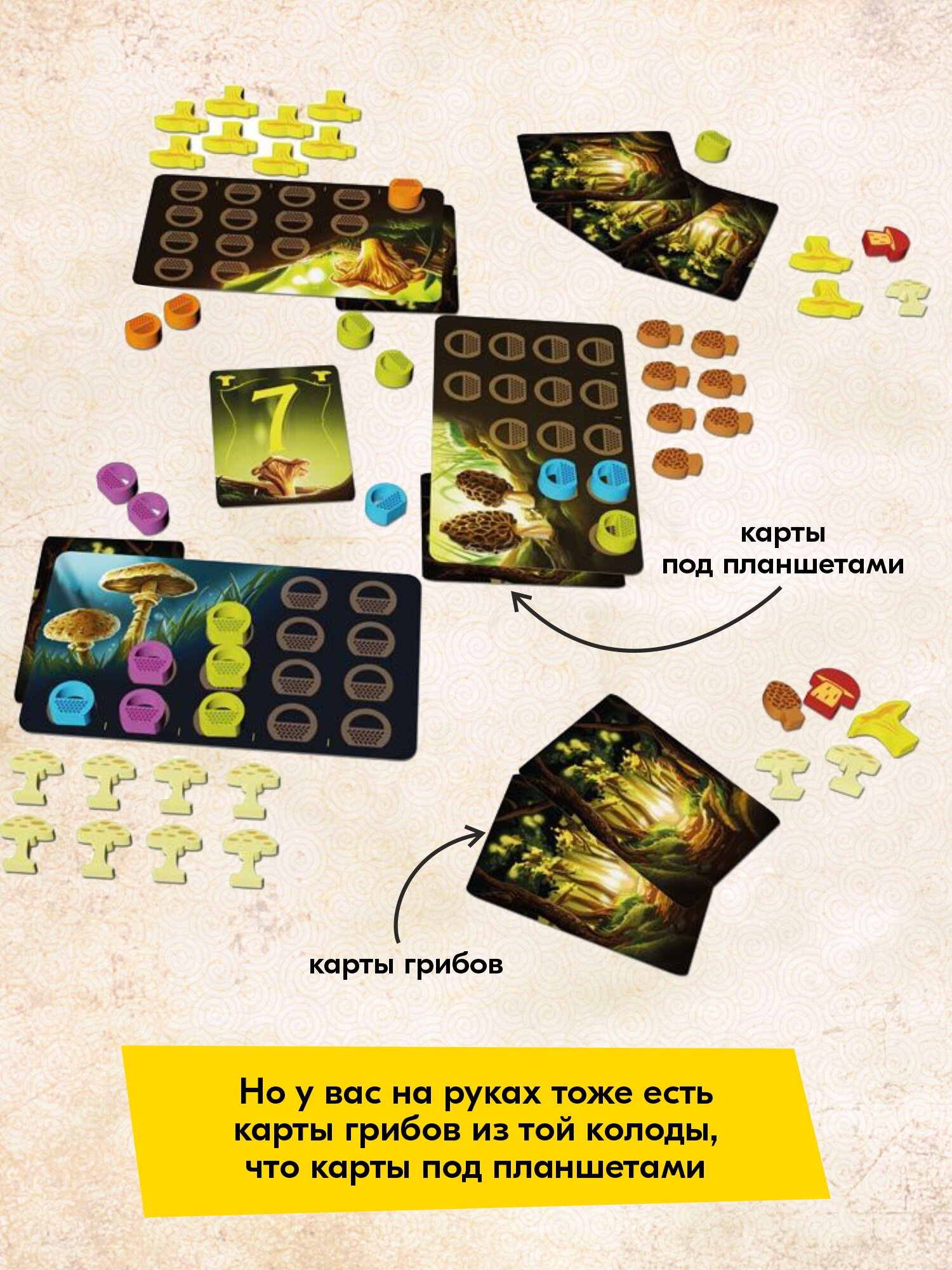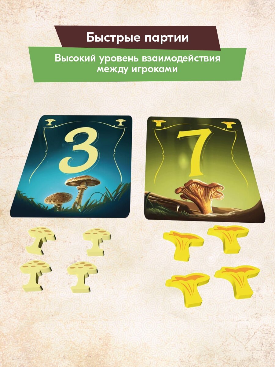 | Комплектация | В состав игры Грибные места входит: 35 деревянных фишек корзинок; 56 деревянных фишек грибов: 14 лисичек, 14 сморчков, 14 белых грибов и 14 грибов-зонтиков; 1 жетон первого игрока (с изображением леса); 4 планшета грибных мест; 16 карт информации, правила игры. |