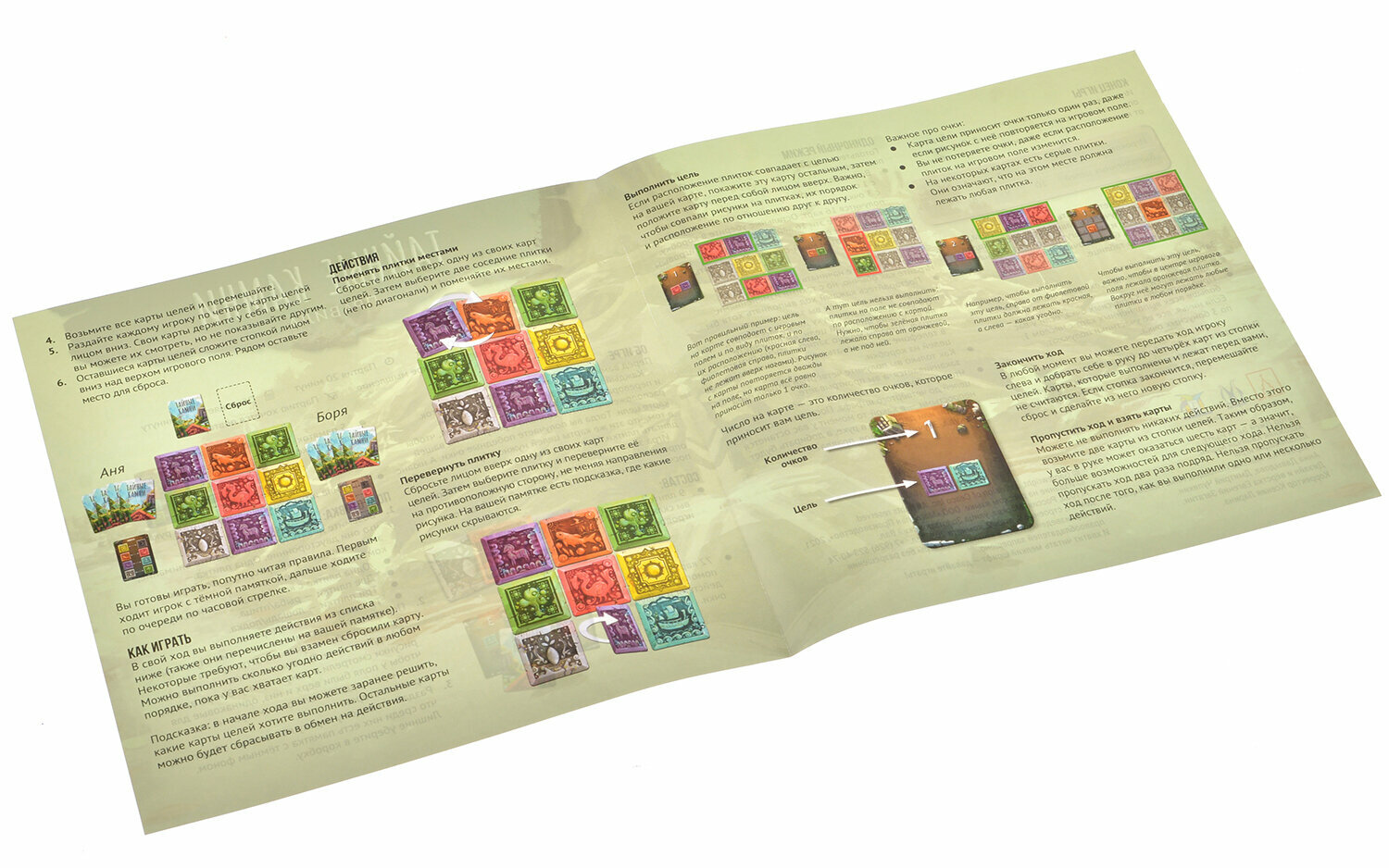 | Комплектация | 9 тиснёных плиток из плотного картона, 72 карты целей, 5 памяток для игроков, правила игры |
