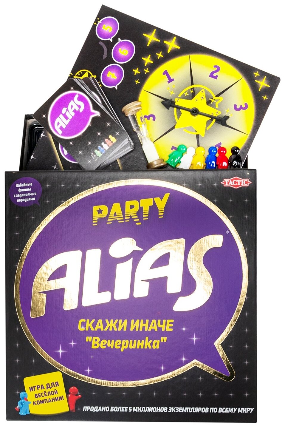 | Комплектация | игровое поле с вращающейся стрелкой, 6 фишек, 300 карточек со словами, песочные часы, правила игры |