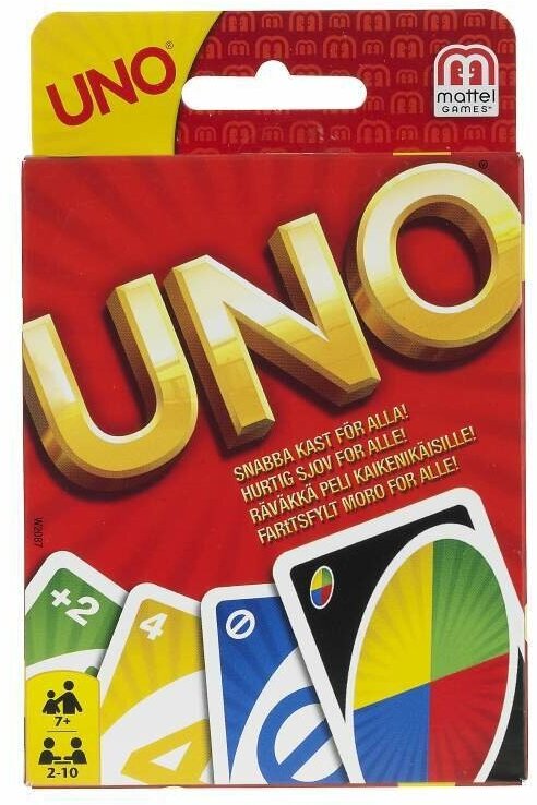 | Комплектация | 112 карт: 19 синих карт, 19 зеленых, 19 красных, 19 желтых, 8 карт "возьми две", 8 карт "смени направление", 8 карт "пропусти ход", 4 "дикие" карты, 4 "дикие" карты "возьми четыре", 1 "дикая" карта "перетасовка", 3 пустые "дикие" карты, подробные правила игры на русском языке |