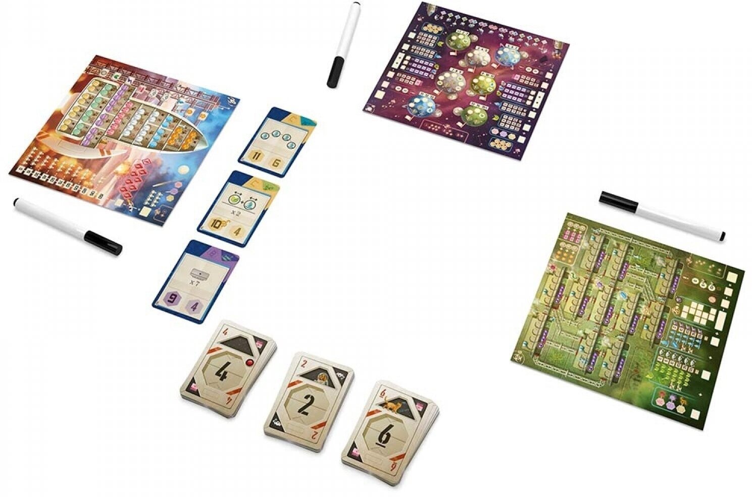 | Комплектация | 63 карты звездолётов; 48 карт миссий; 6 стирающихся маркеров;11 карт для соло-режима ASTRA; 1 карта капитана с маркерной поверхностью для приключения № 8 и режима кампании; 24 двусторонних игровых поля с маркерной поверхностью: 6 наборов из 4 полей с разными приключениями на каждой стороне (приключения пронумерованы от 1 до 8); 97 карт для режима кампании. |