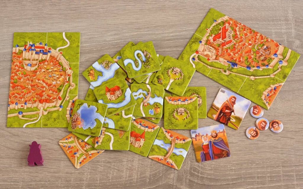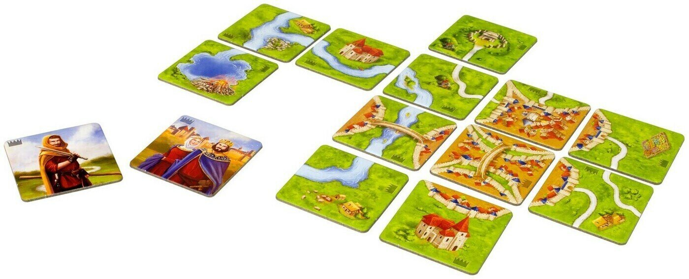 | Комплектация | 2 двухсторонних планшета крепости Каркассон, фишка графа, 5 новых квадратов местности, 5 квадратов с капищем, 12 новых квадратов с рекой, квадрат короля, 2 жетона короля, квадрат рыцаря-разбойника, 2 жетона рыцаря-разбойника, правила игры |