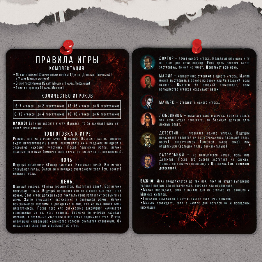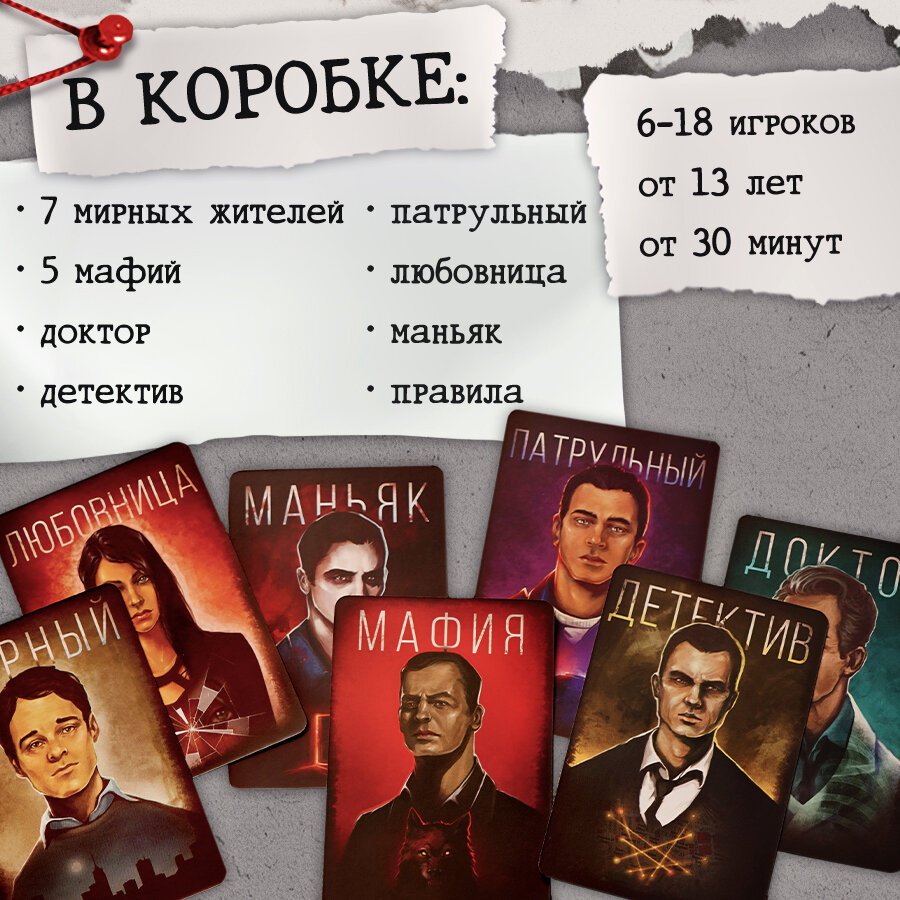 | Комплектация | 7 карт мирных жителей, карта доктора, карта детектив, карта патрульного, карта любовницы, карта маньяка, 5 карт мафии, правила |