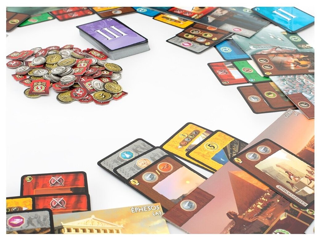 | Комплектация | 7 полей Чудес Света, 49 карт Эпохи I, 49 карт Эпохи II, 50 карт Эпохи III, 48 жетонов Конфликтов, 24 монеты достоинством «3», 54 монеты достоинством «1», 1 блокнот для подсчёта очков, 3 памятки с описанием эффектов, 1 список карт и цепочек карт, правила игры |